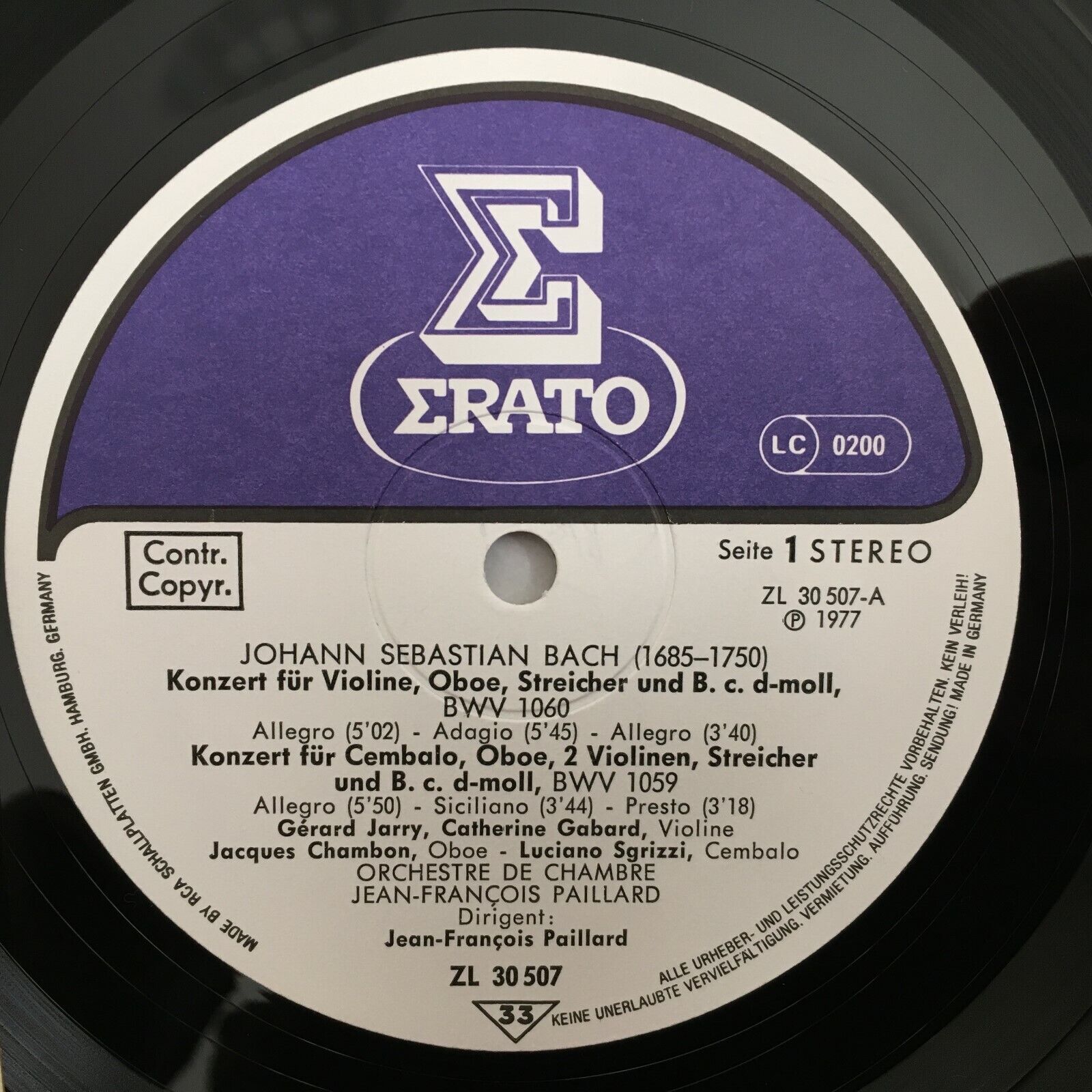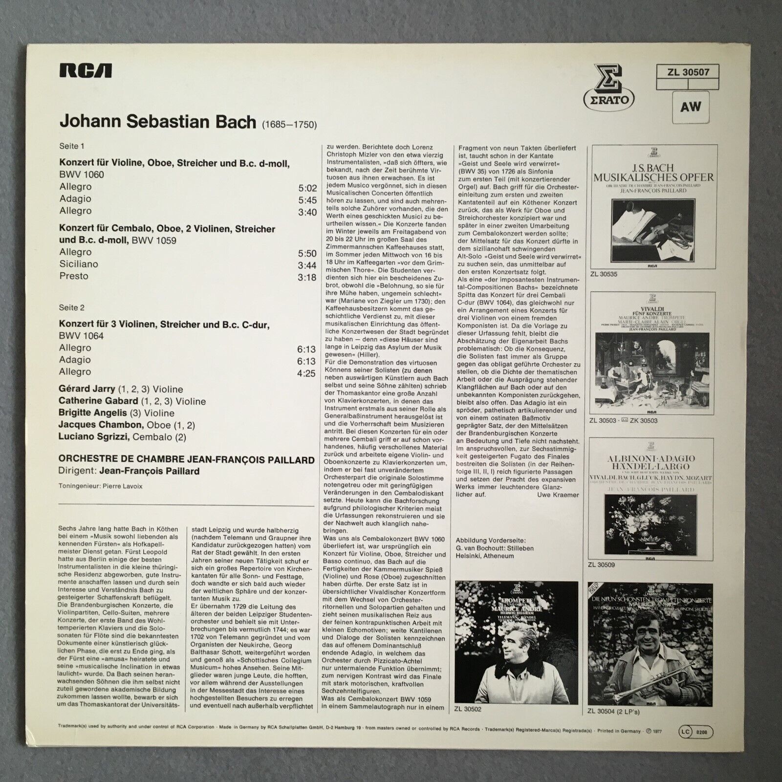 X540 Bach 3 Concertos Jarry Gabard Chambon Paillard Erato ZL 30507 Stereo