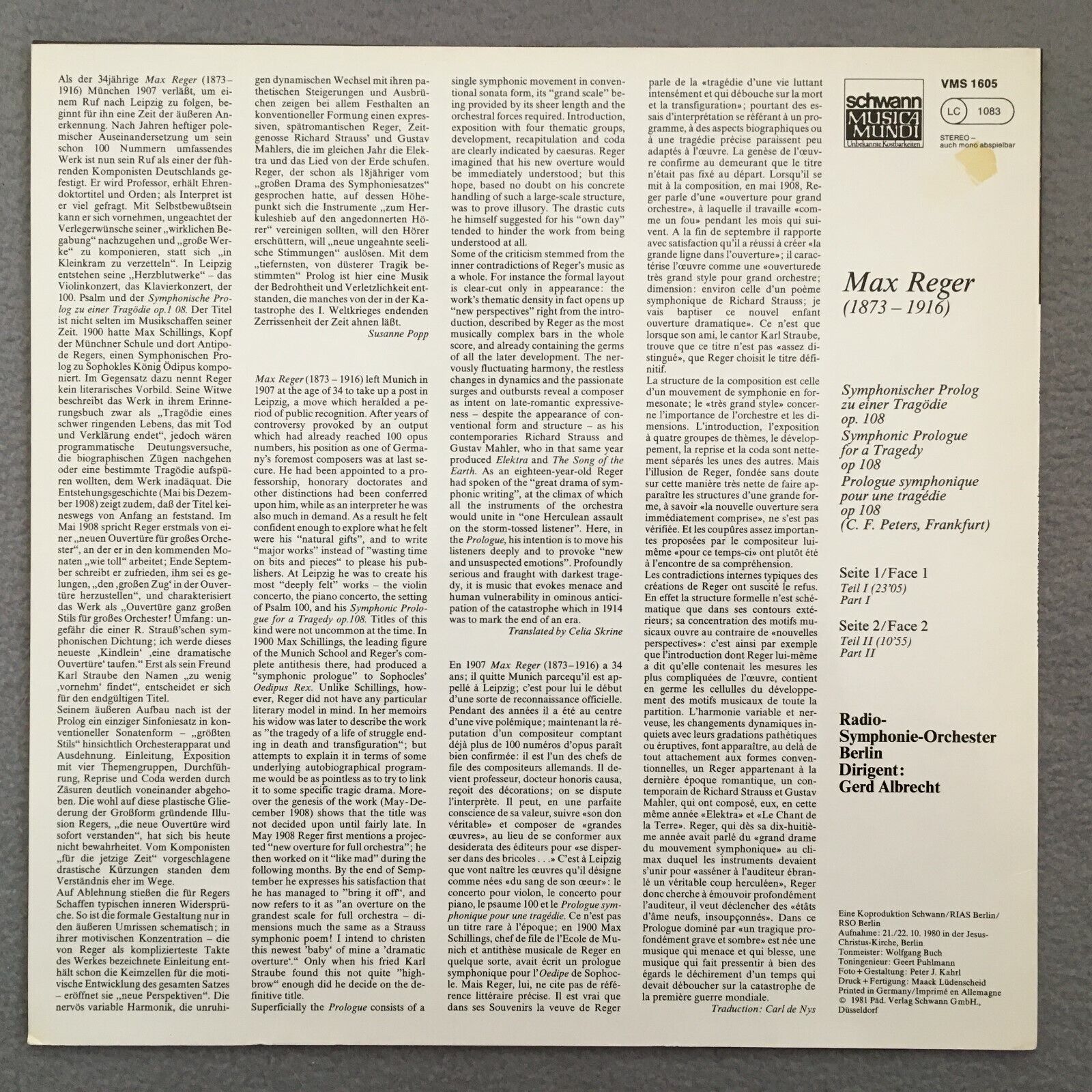 X979 Reger Symphonic Prolog Op.108 Albrecht Schwann Musica Mundi VMS 1605 Stereo