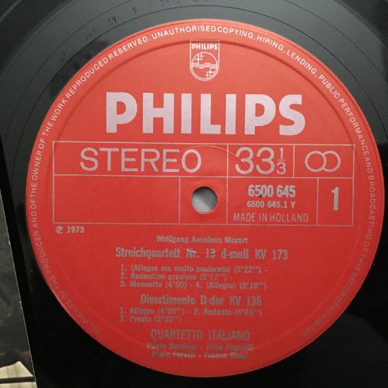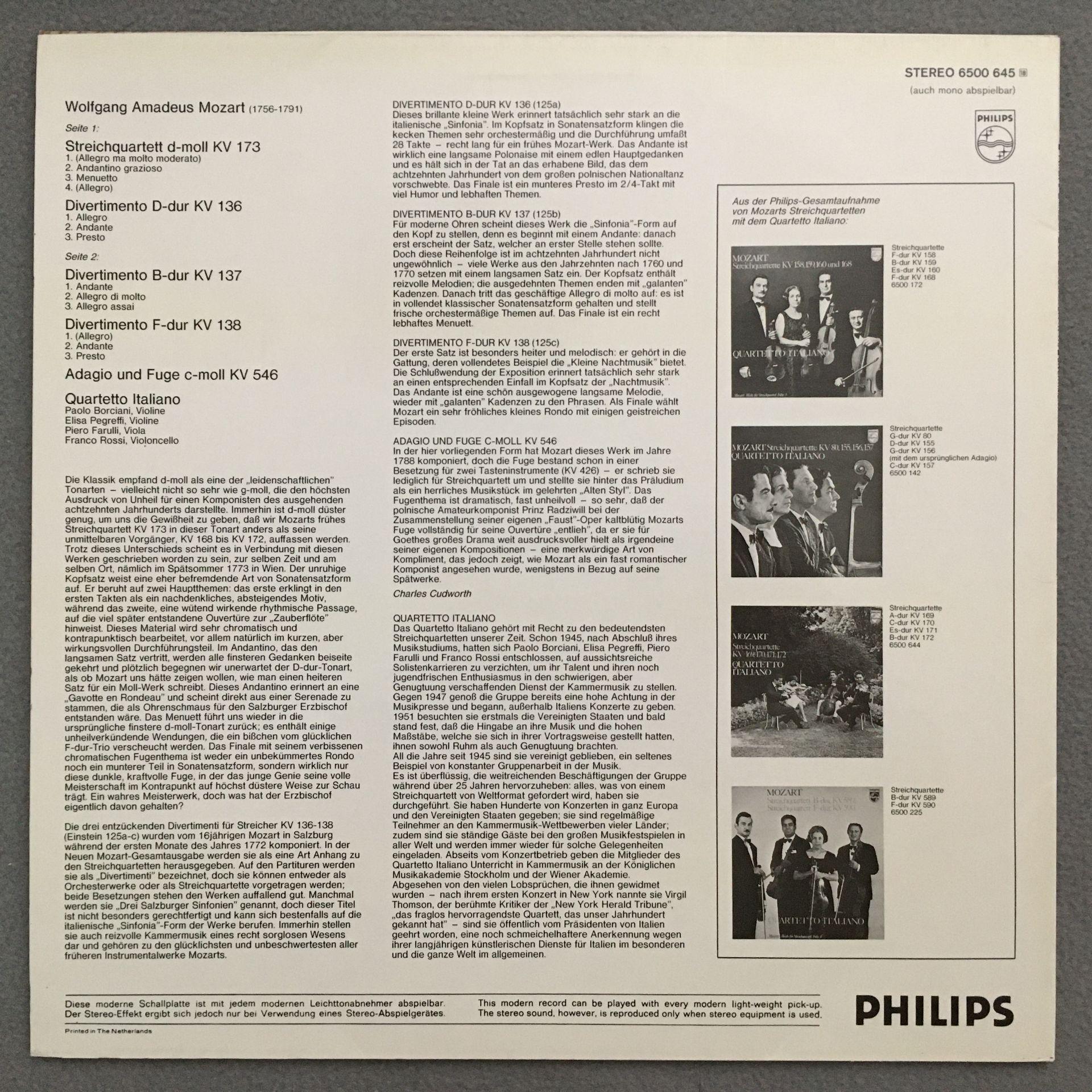 N098 Mozart String Quartet Divertimenti Quartetto Italiano Philips 6500 645 Ster