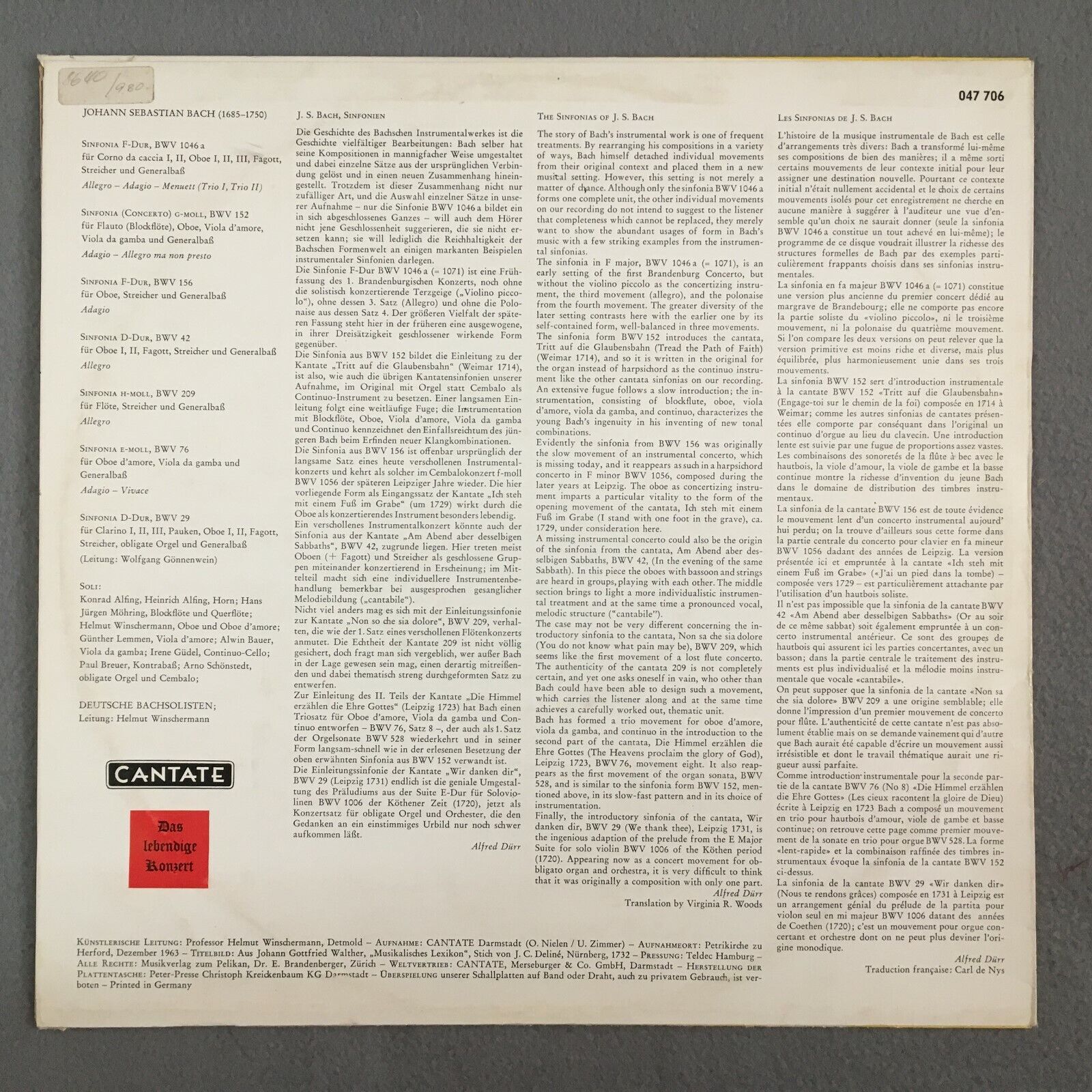 Z878 Bach Symphonies Möhring Alfing Gönnenwein Winschermann Cantate 047 706