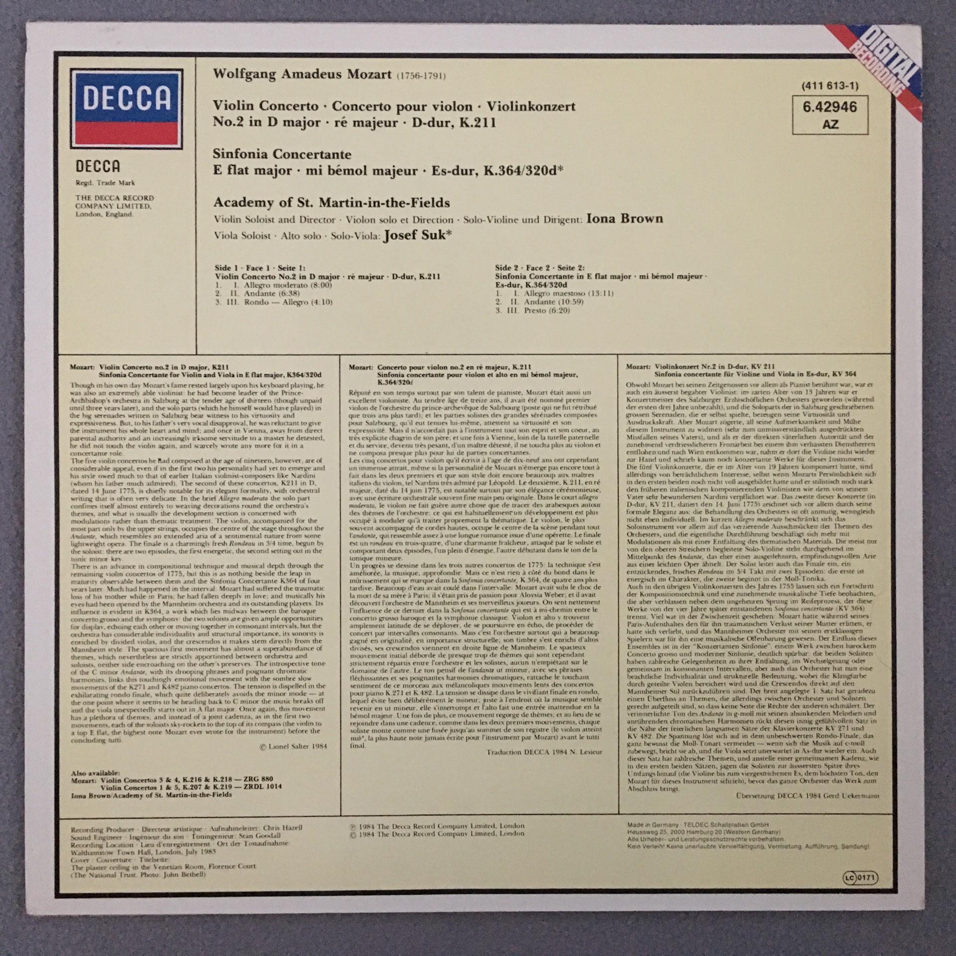 N118 Mozart Violin Concertos Suk Brown DECCA 6.42946 AZ Digital Stereo