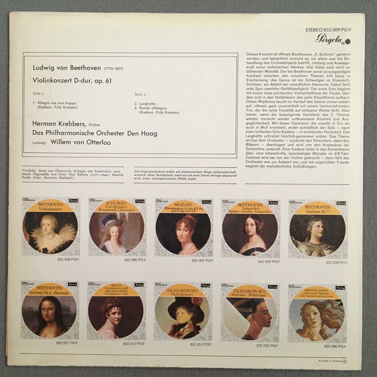 Z990 Beethoven Violin Concerto Krebbers van Otterloo Pergola 832 009 PGY Stereo