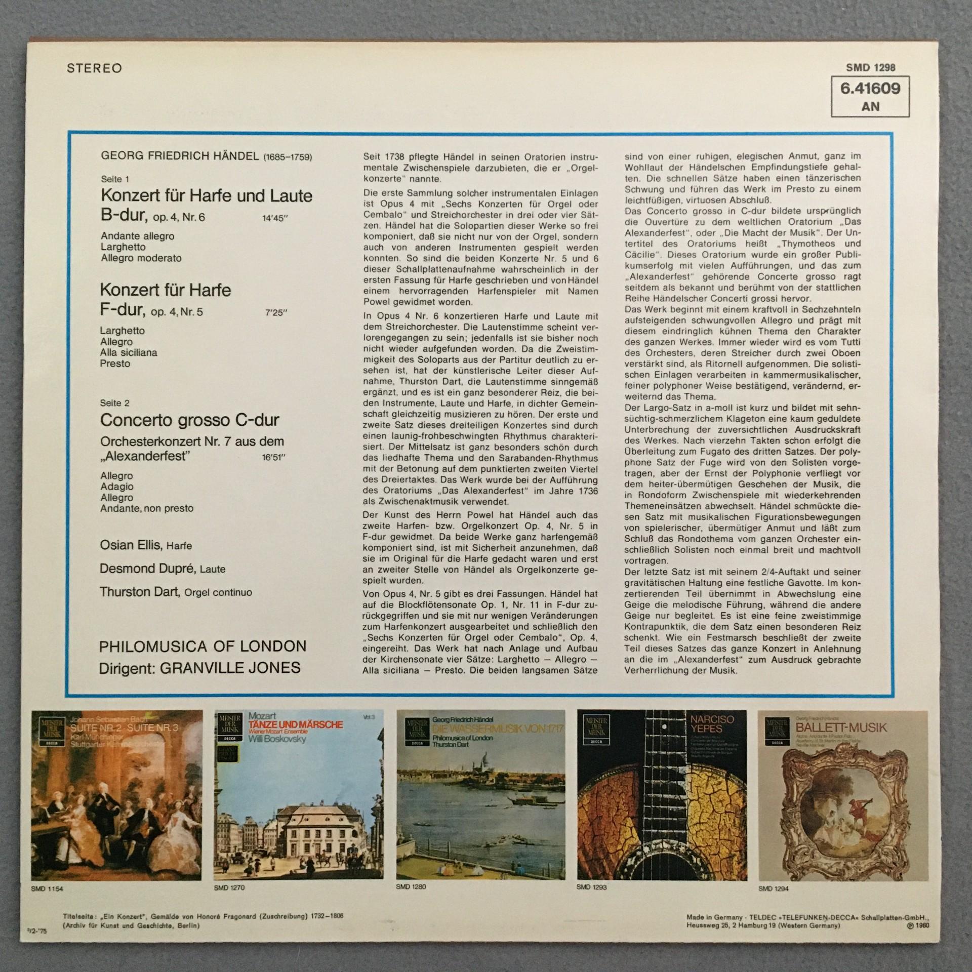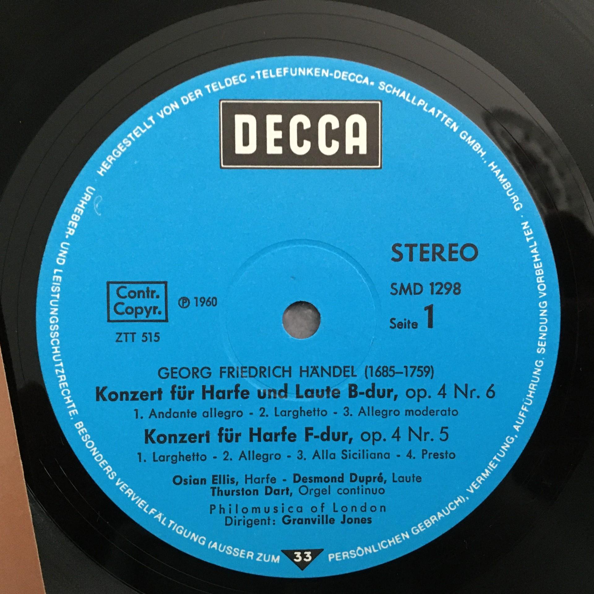 U233 Handel Harp Concertos Ellis Dupre Dart Jones DECCA 6.41609 AN Stereo