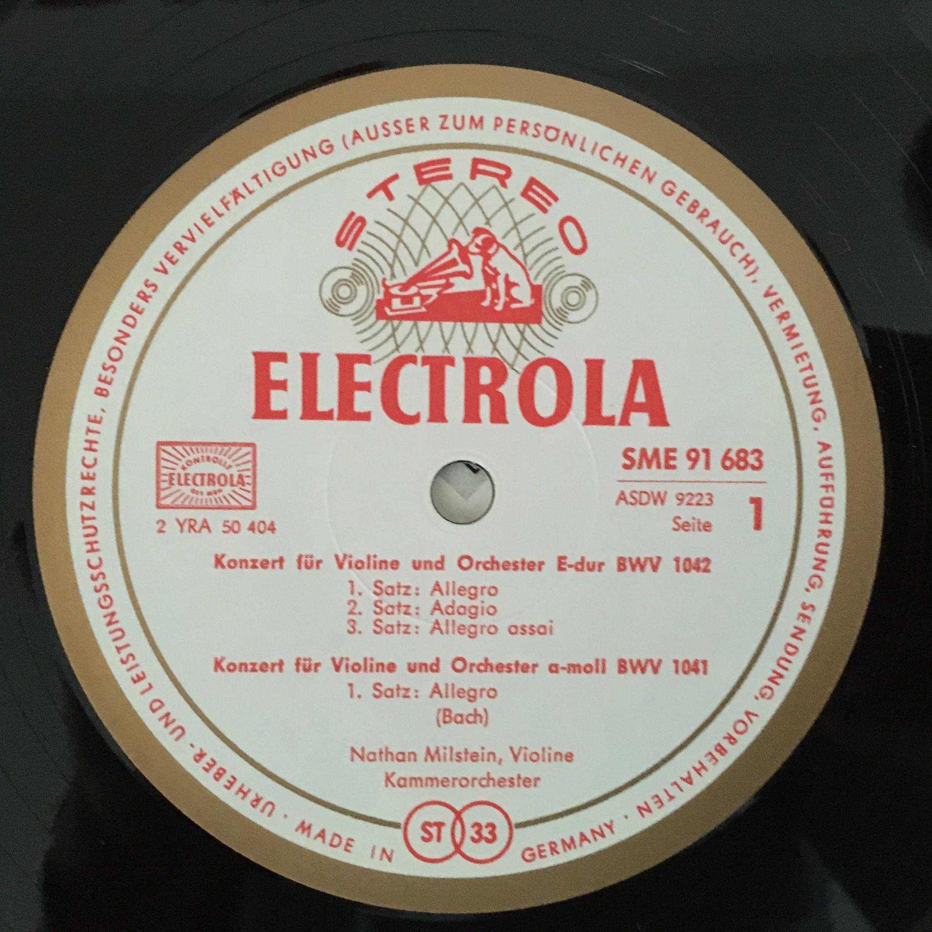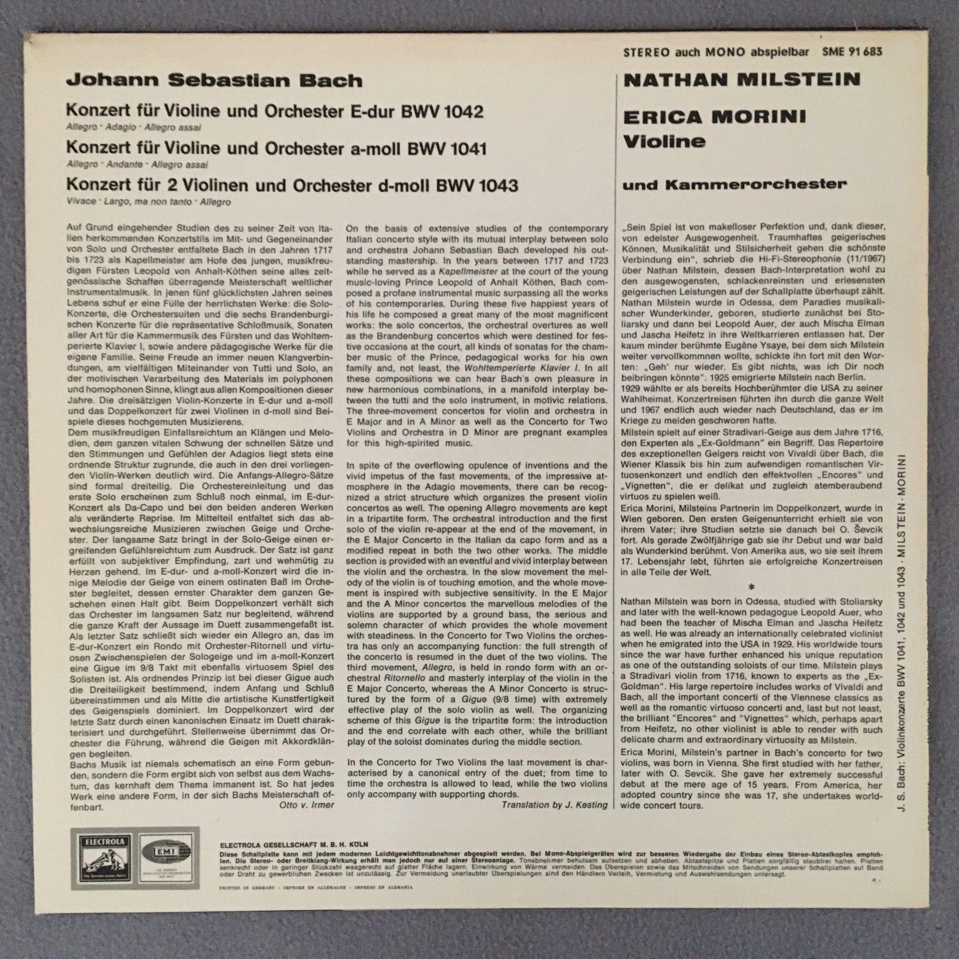 U250 Bach Violin Concertos Morini Milstein Electrola w/g SME 91 683 Stereo