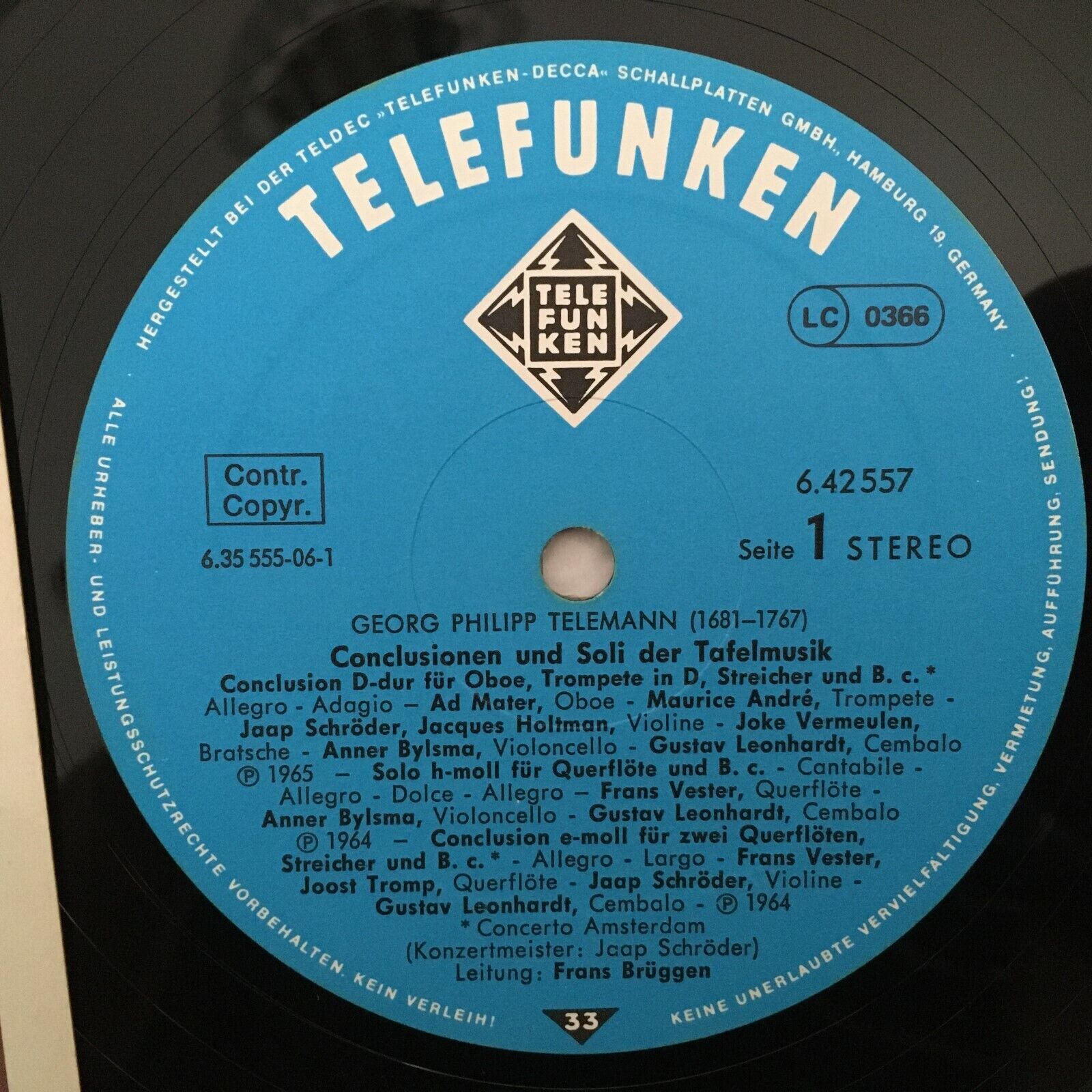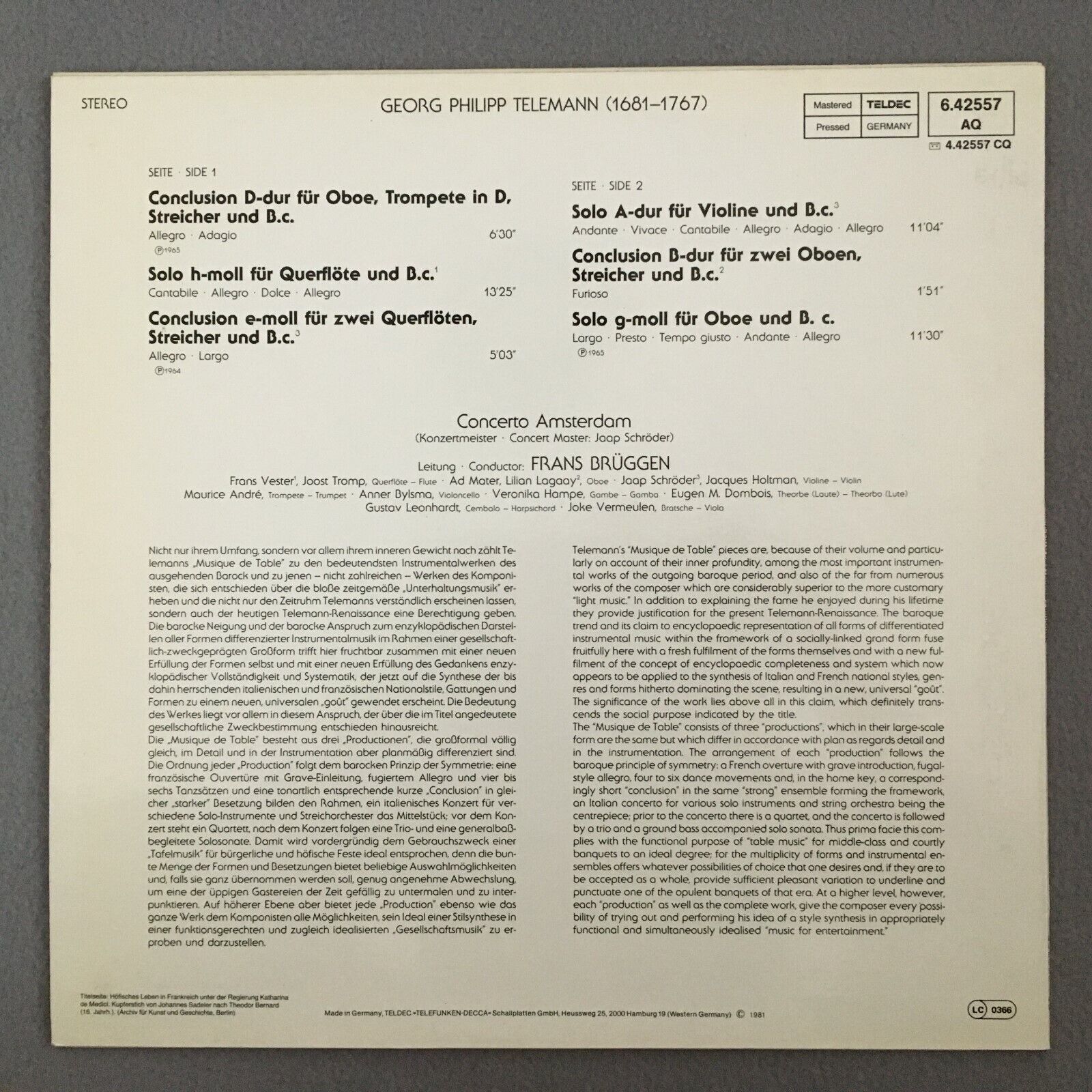 Y149 Telemann Conclusions & Soli Banquet Music Brüggen Telefunken 6.42557 AQ St