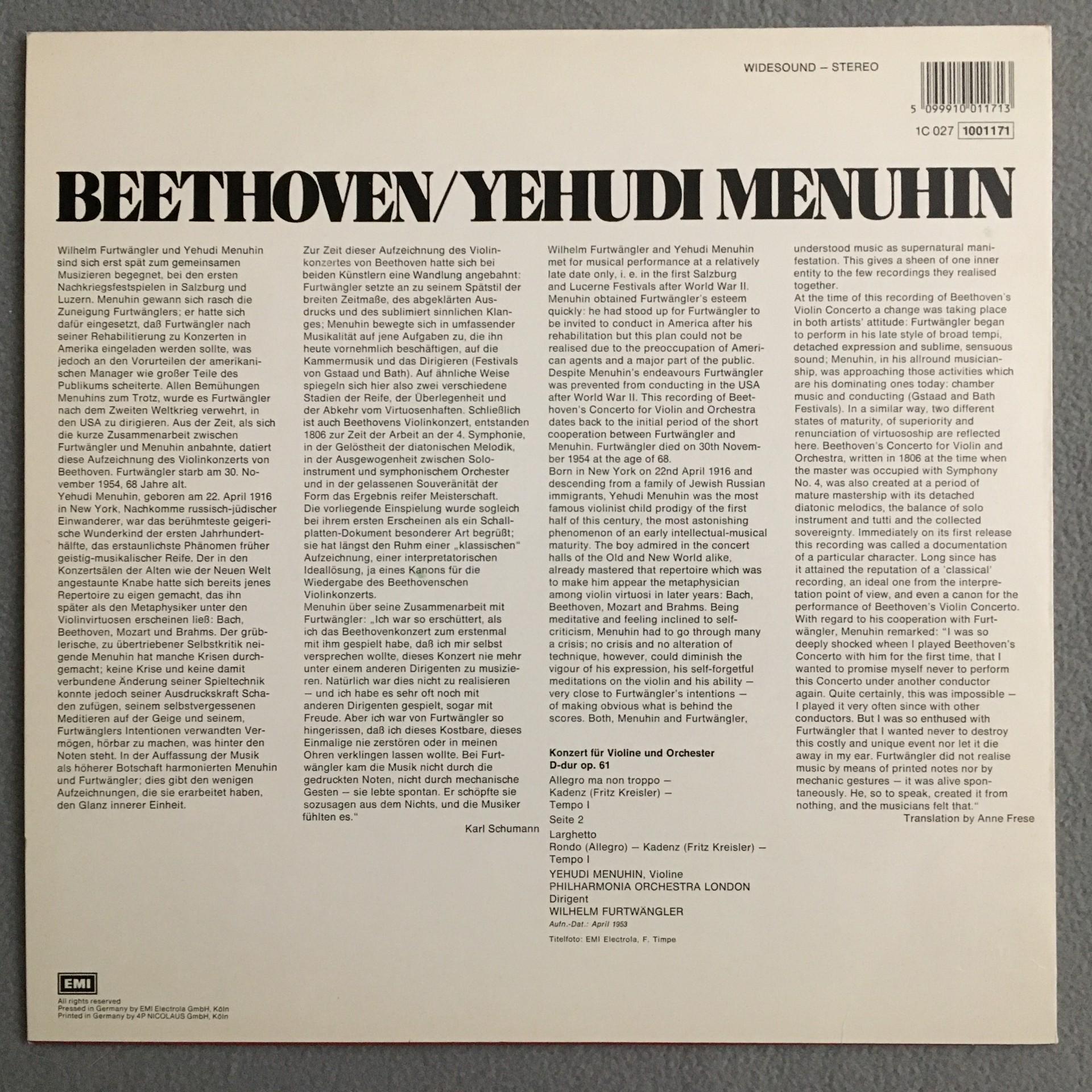 U300 Beethoven Violin Concerto Menuhin Furtwängler EMI 1C 027 1001171 Stereo