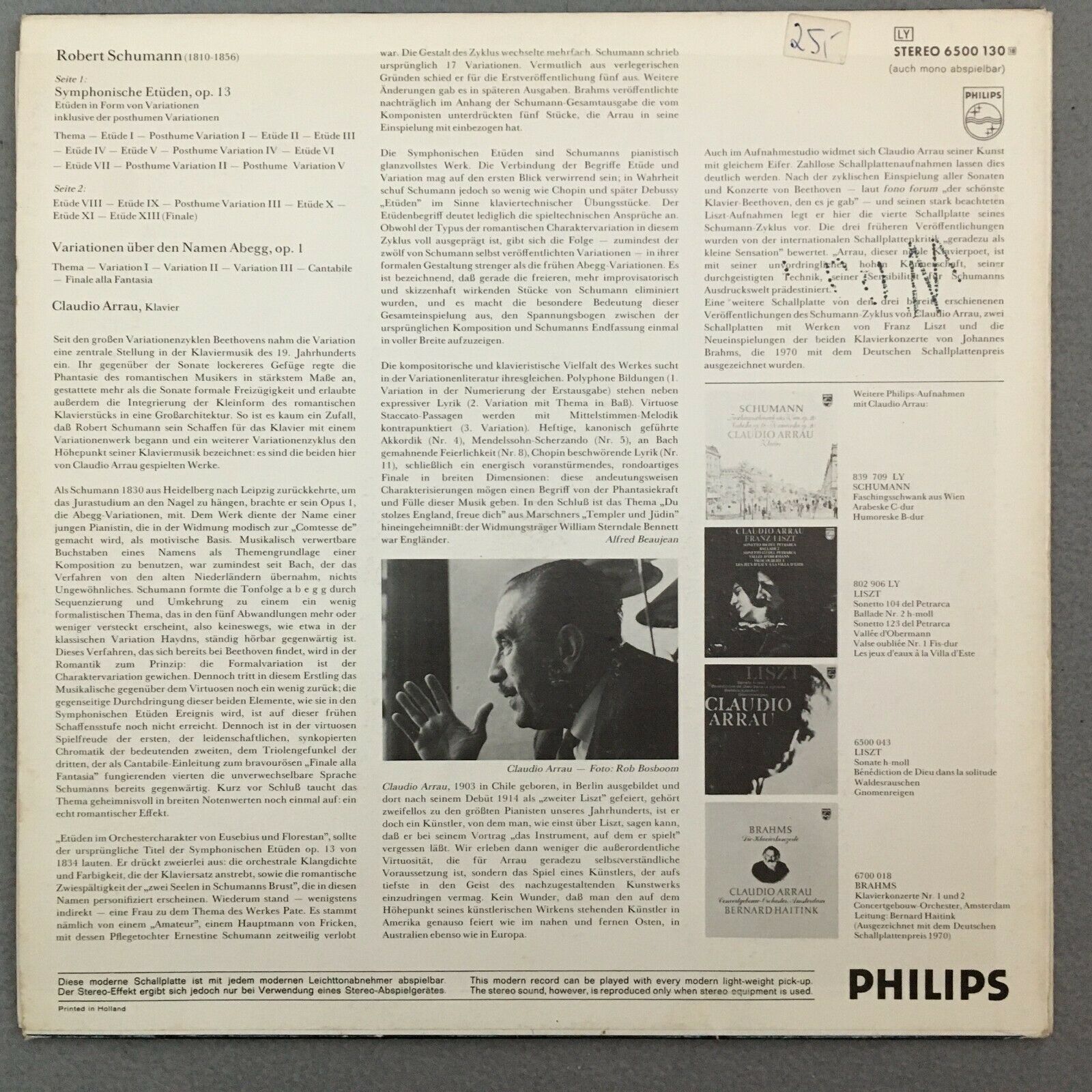 Y530 Schumann Symphonic Etudes Abegg Variations Arrau Philips 6500 130 Stereo
