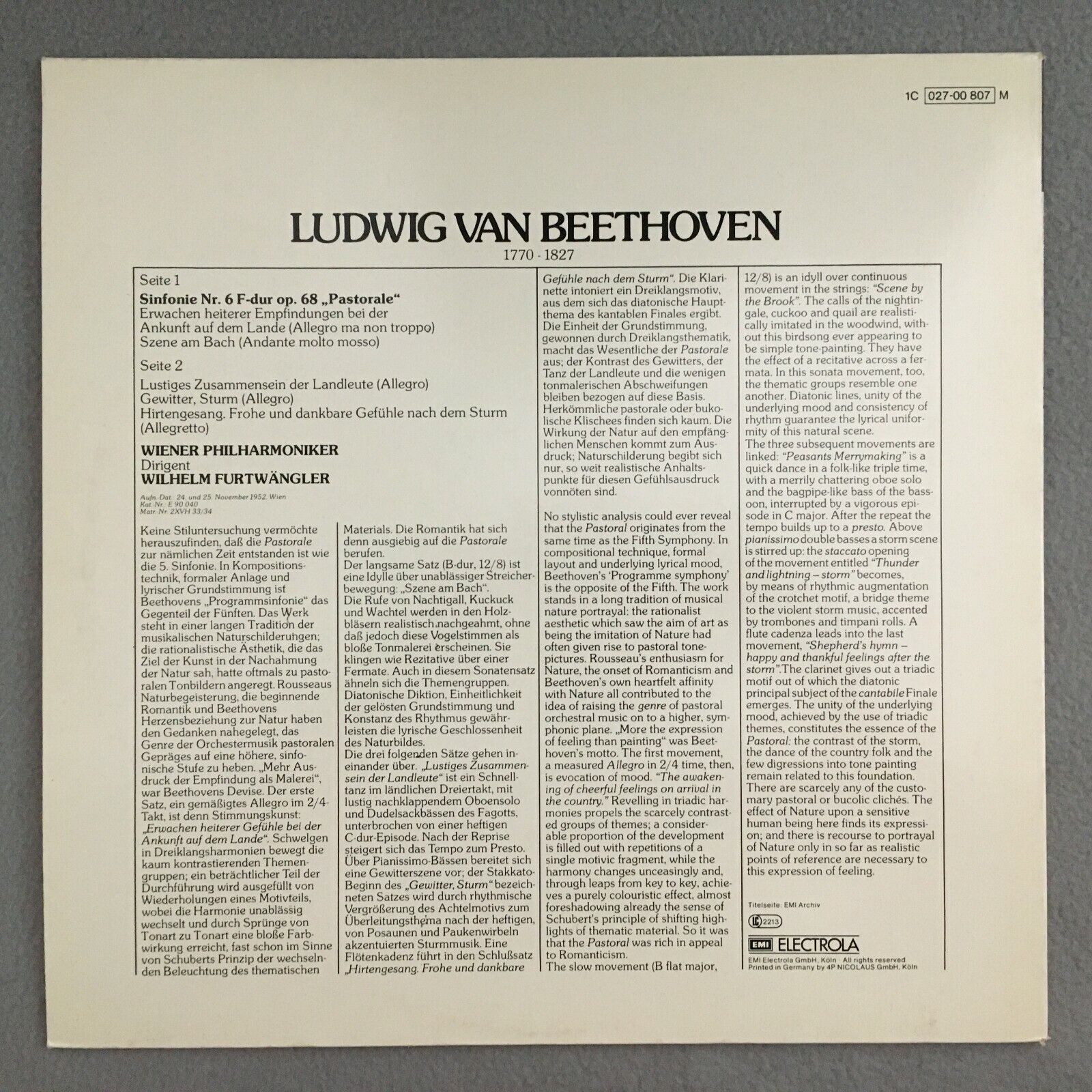 Y829 Beethoven Symphony No.6 Furtwangler VPO EMI 1C 027-00 807 M