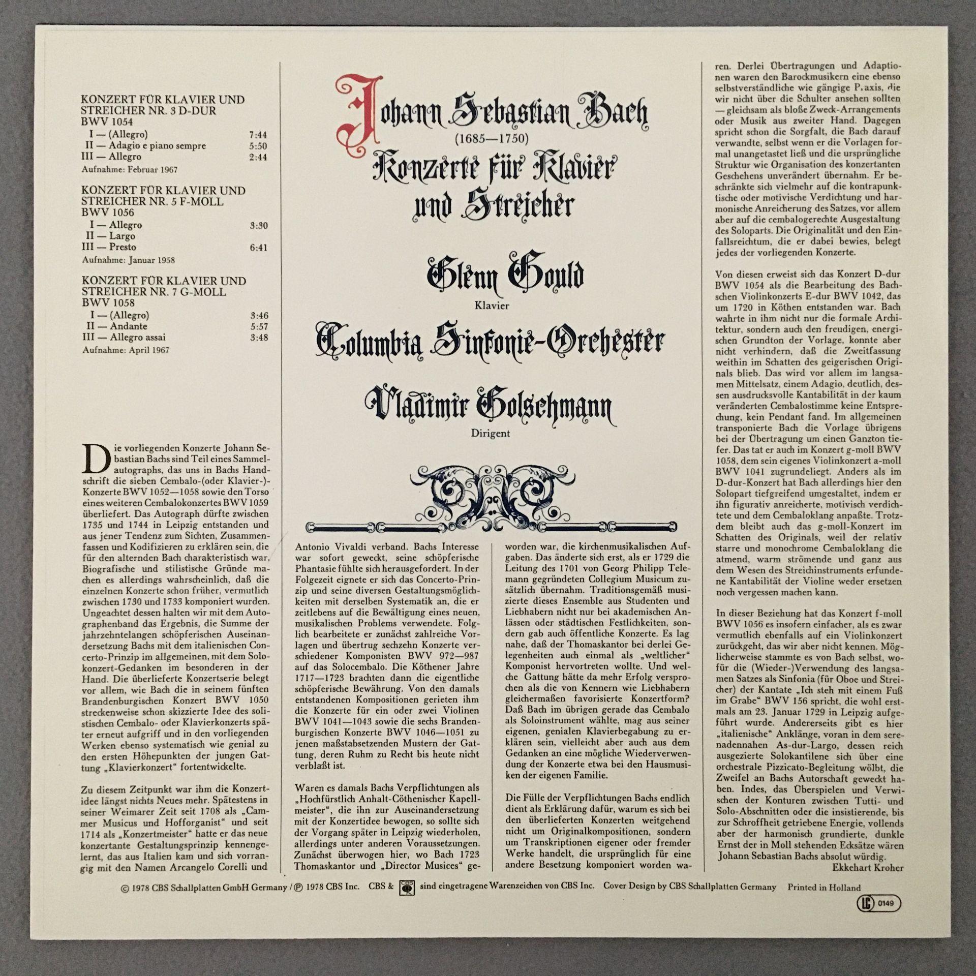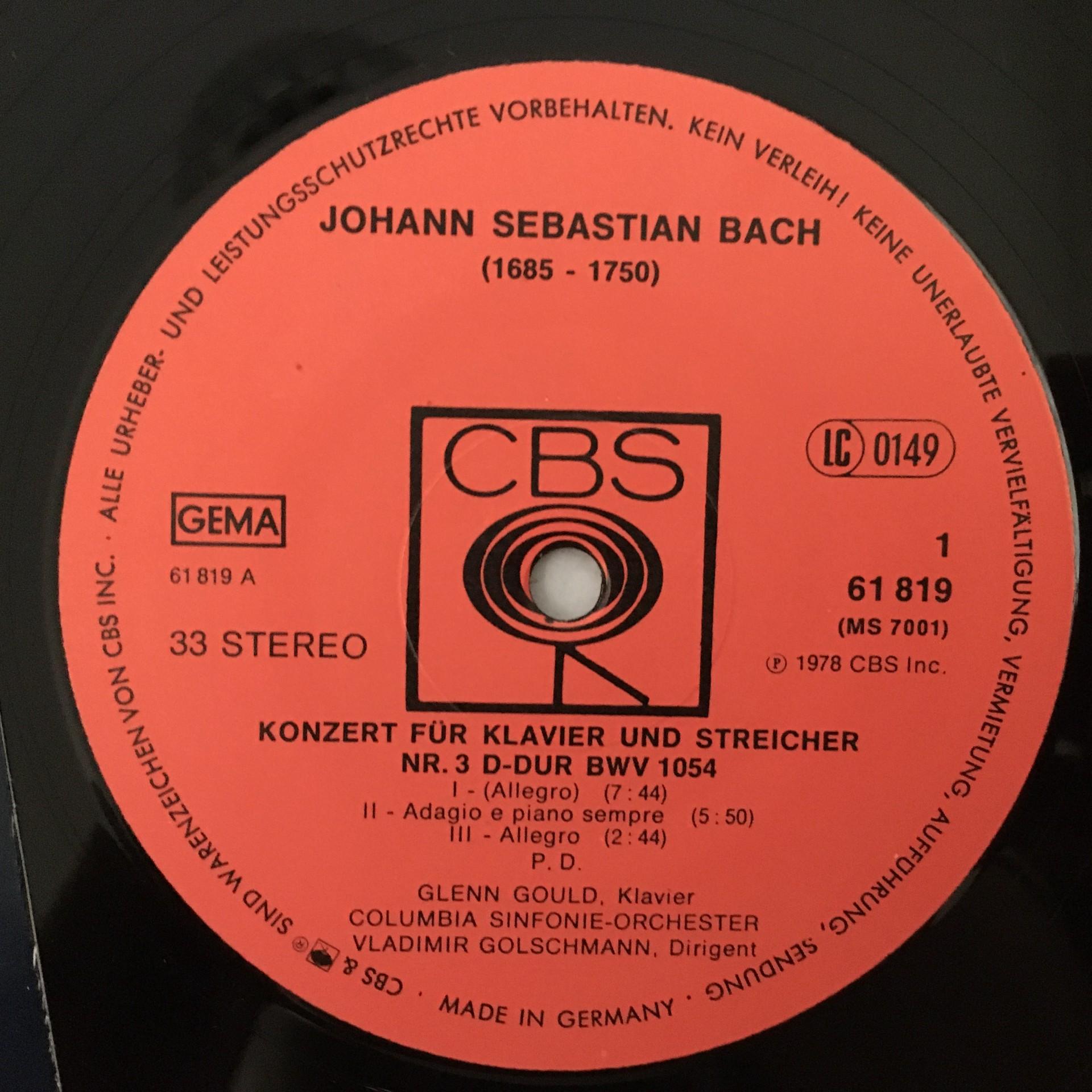 N171 Bach Piano & String Concertos Gould Golschmann CBS 61 819 Stereo