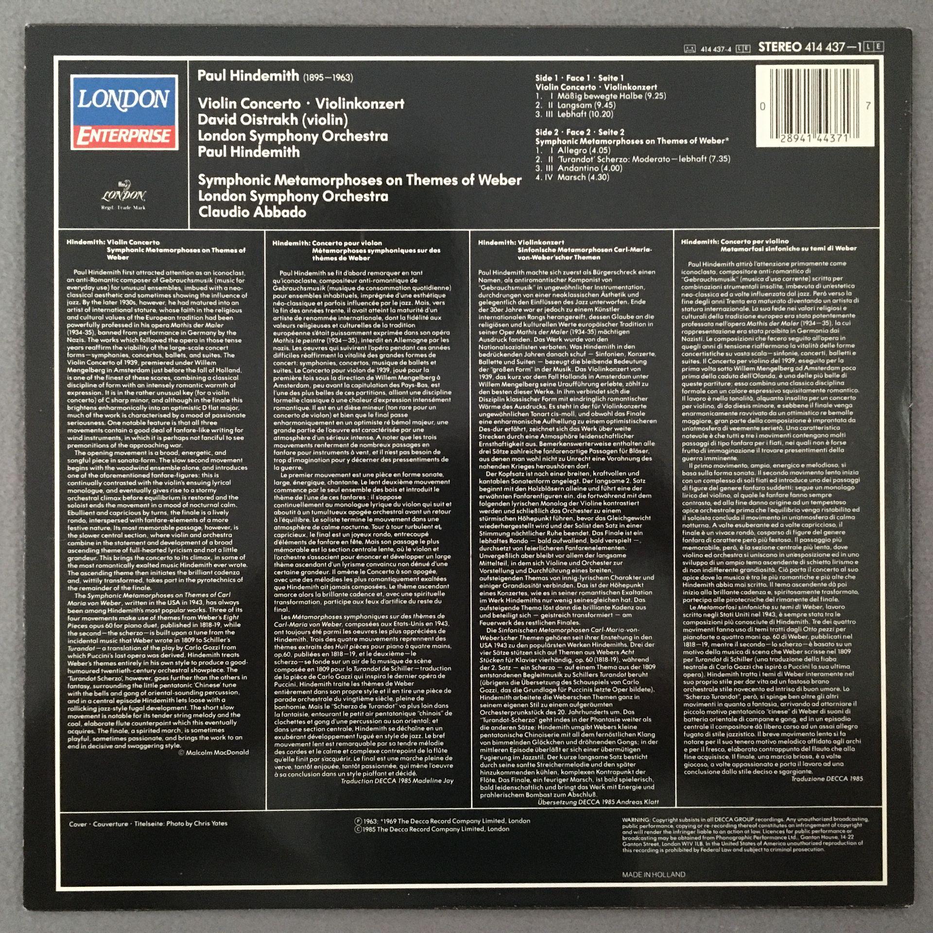 N240 Hindemith Violin Concerto Oistrakh Abbado London 414 437-1 Stereo