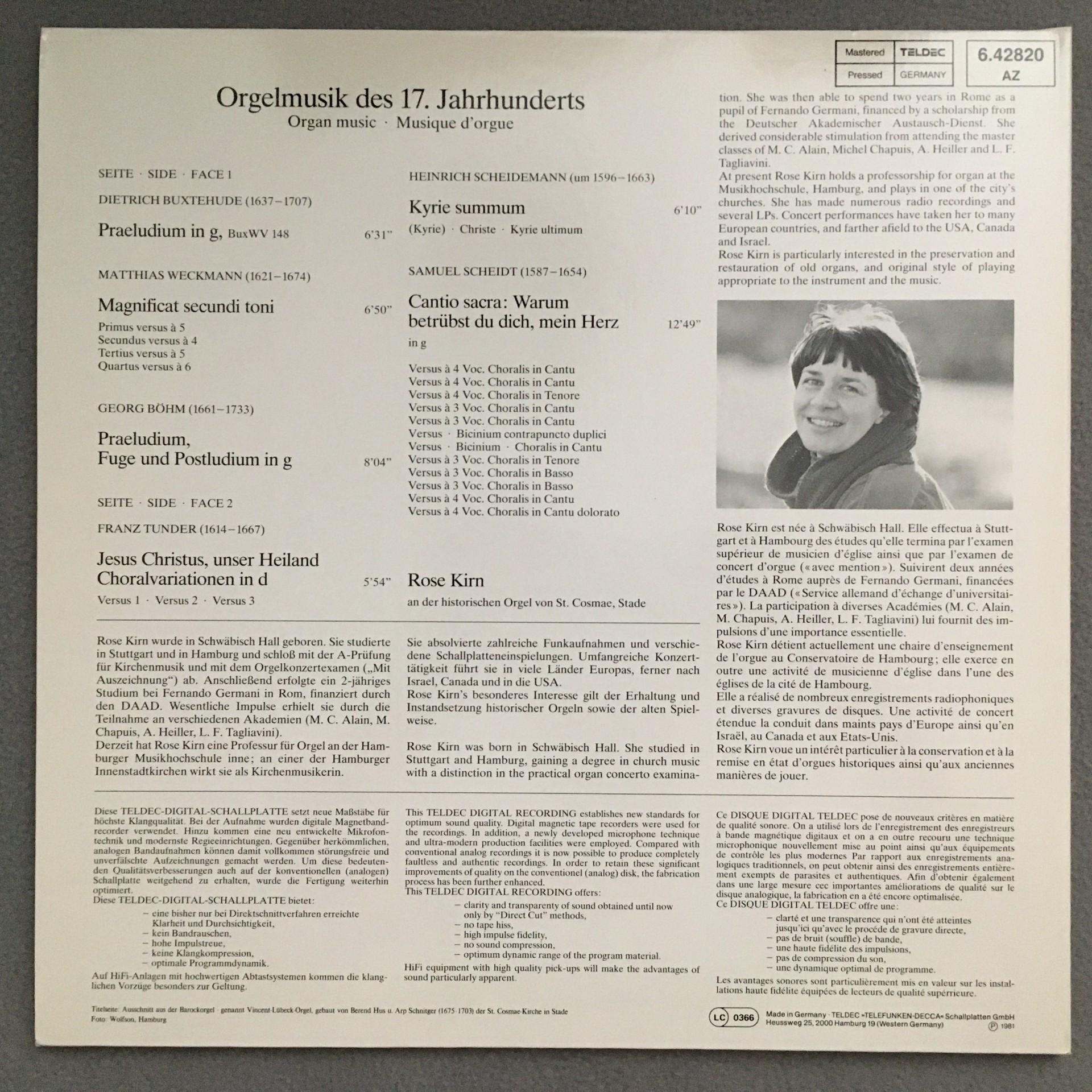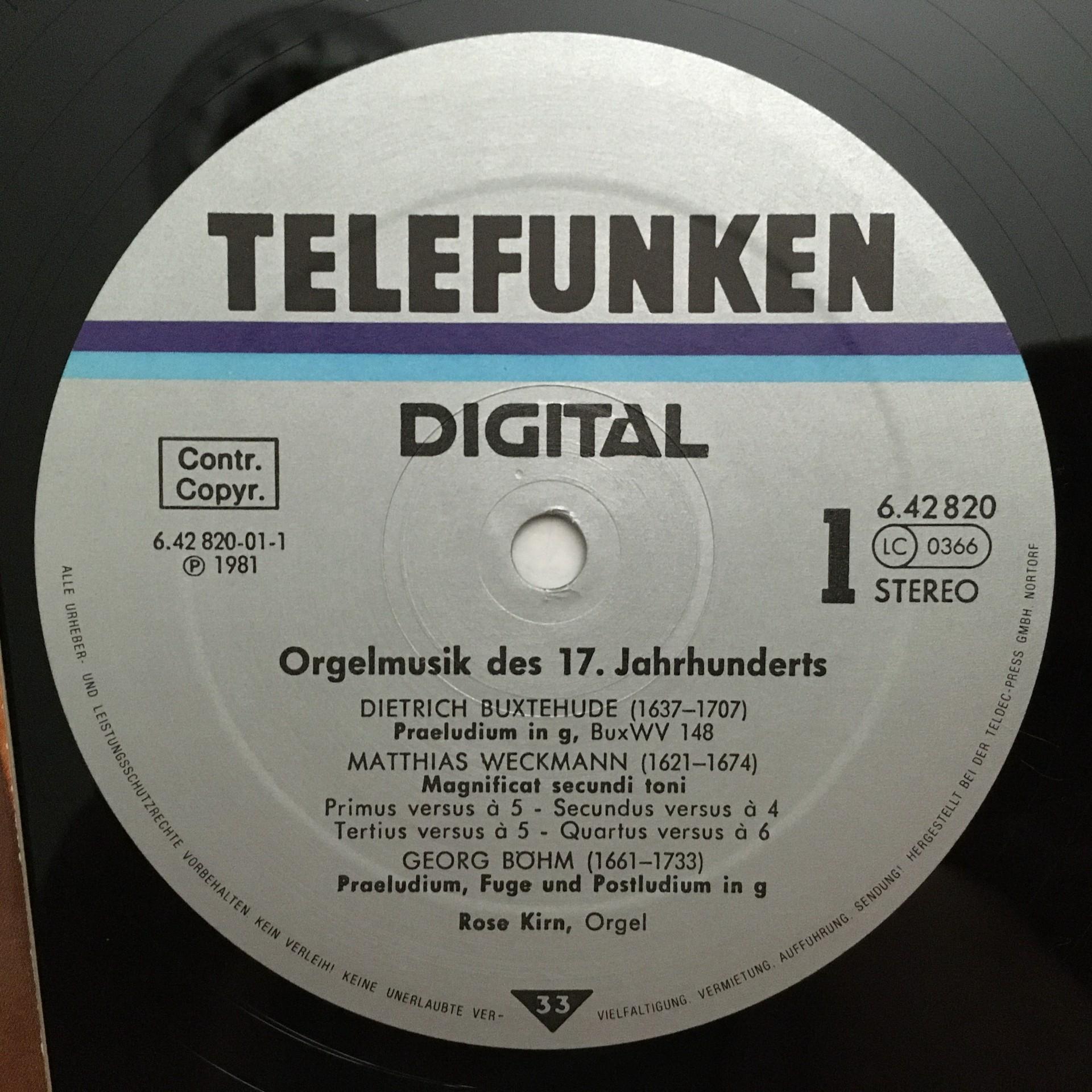 N268 Organ Music 17th Century Kirn Telefunken 6.42820 AZ Stereo