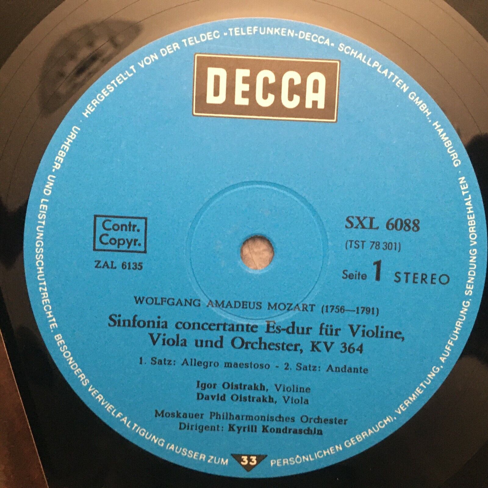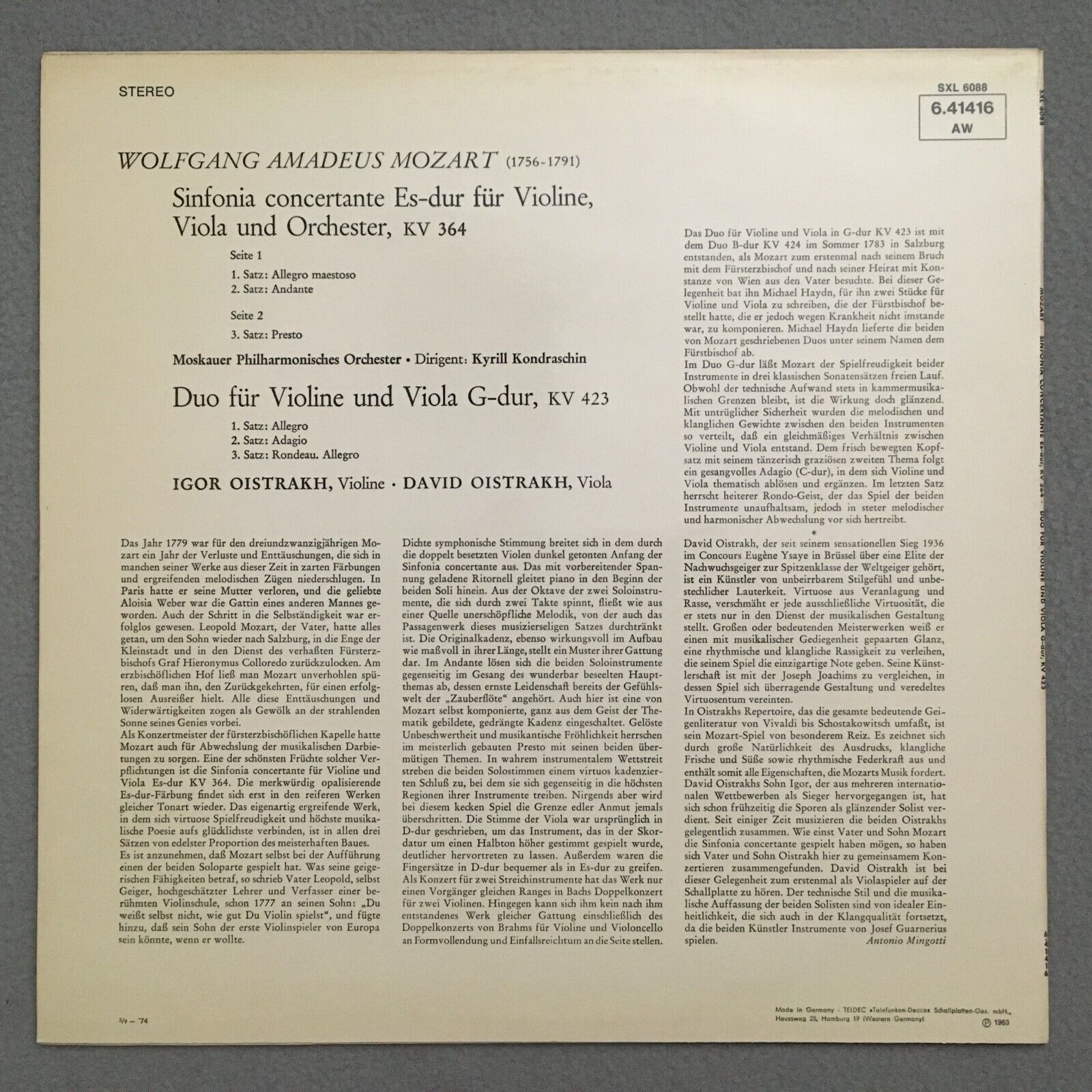 S166 Mozart Sinfonia Concertante Duo I. & D. Oistrakh DECCA SXL 6088 Stereo