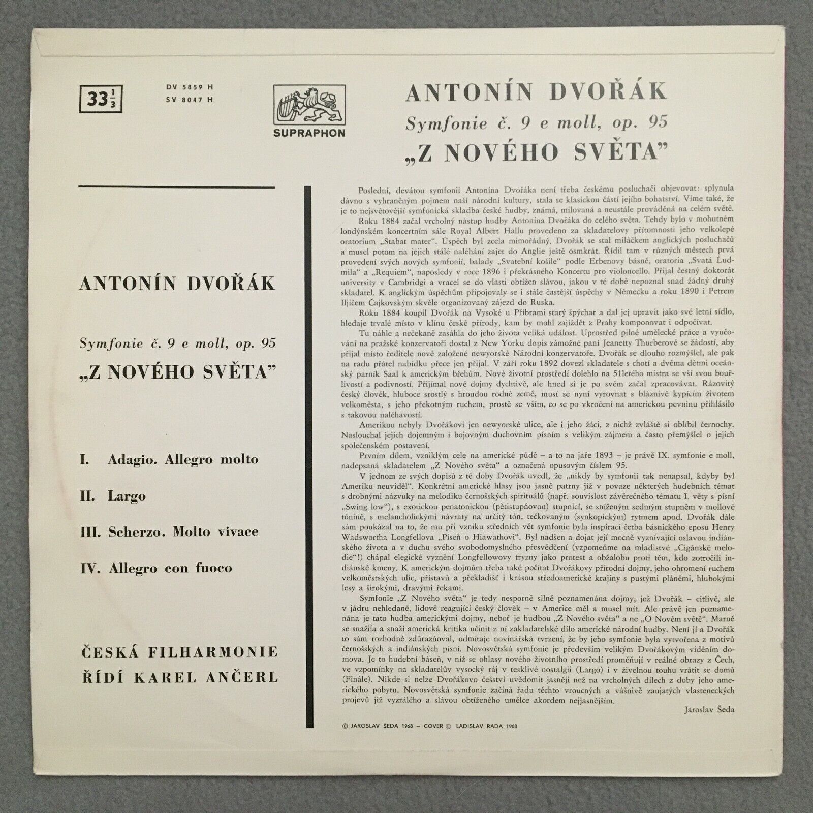 S187 Dvorak Symphony No.9 Ancerl Supraphon SV 8047 H Stereo ED1