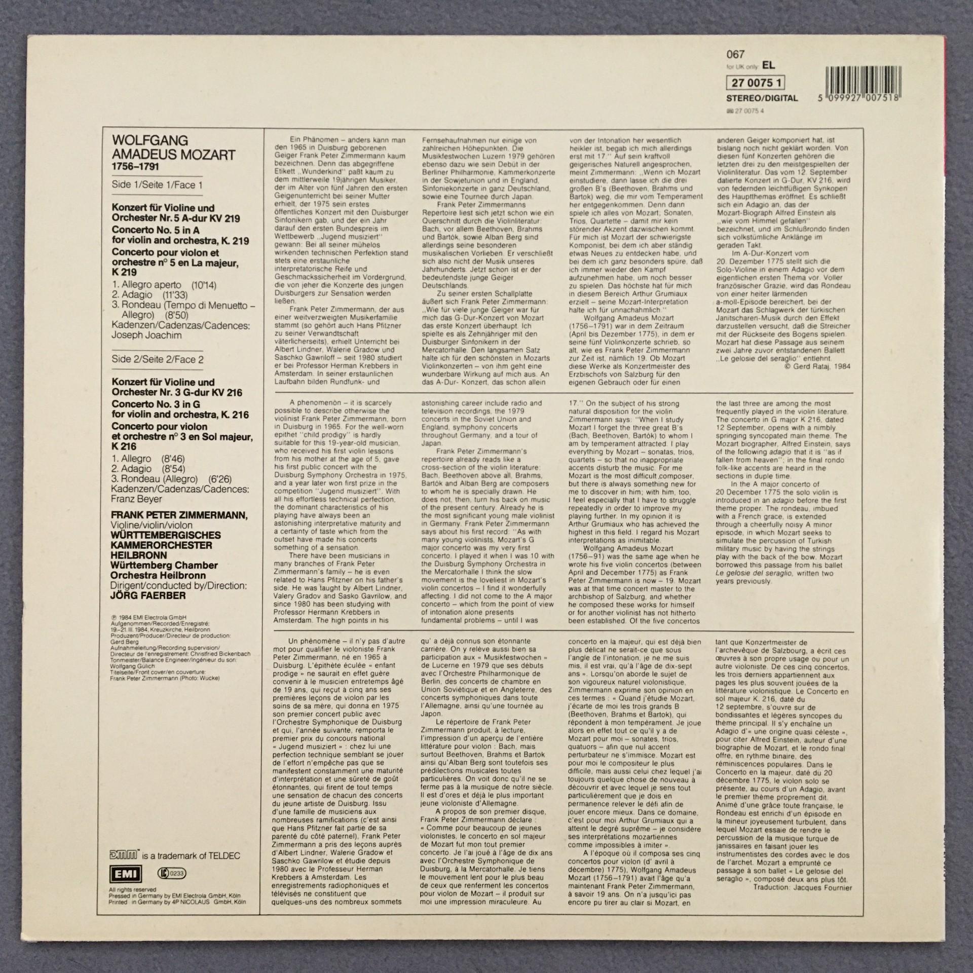 N388 Mozart Violin Concertos Zimmermann Faerber EMI 067 27 0075 1 Digital Stereo