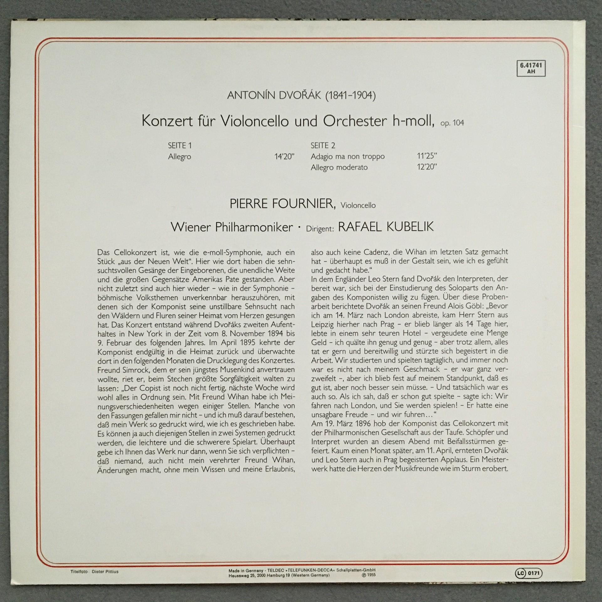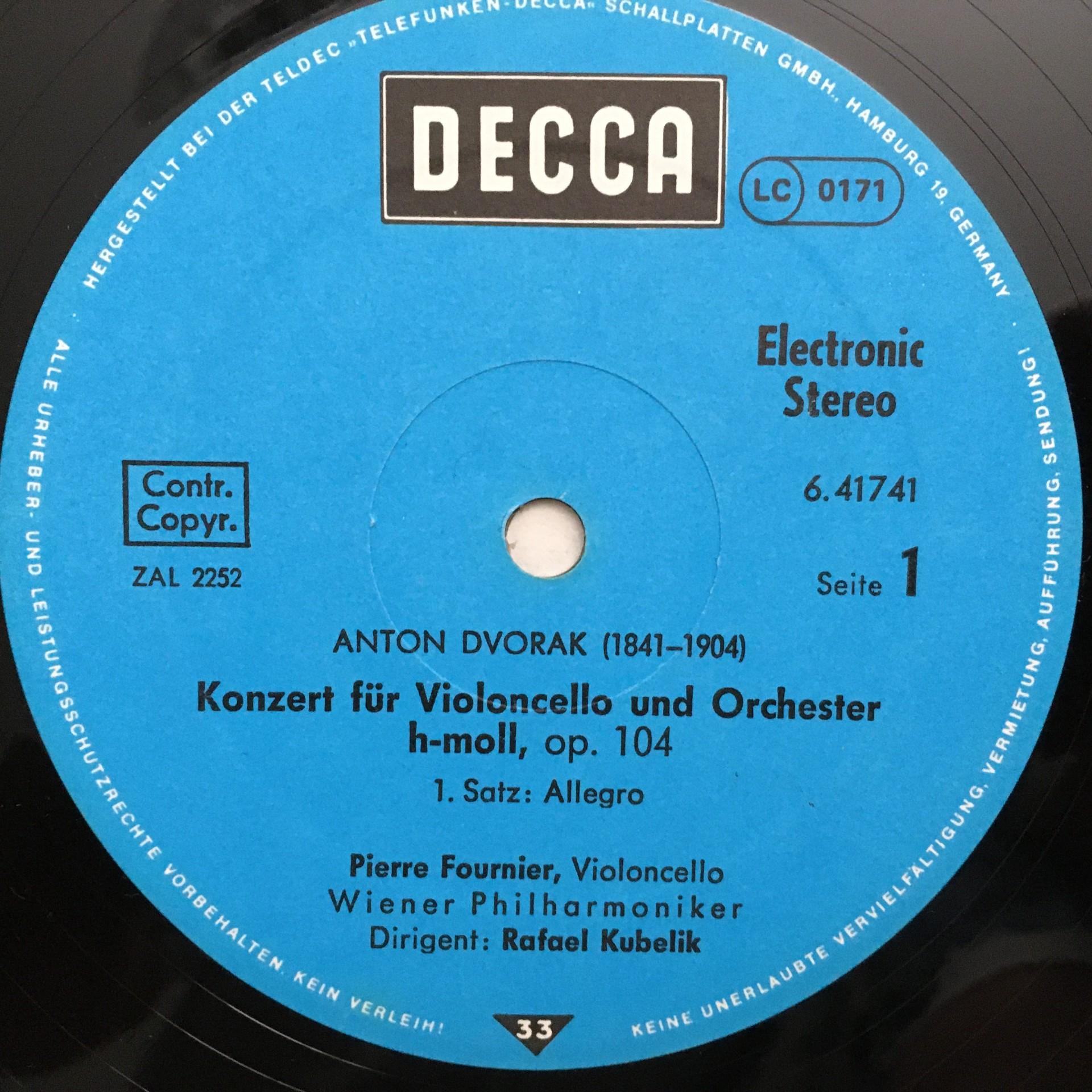 N435 Dvorak Cello Concerto Fournier Kubelik VPO DECCA 6.41741 AH Stereo