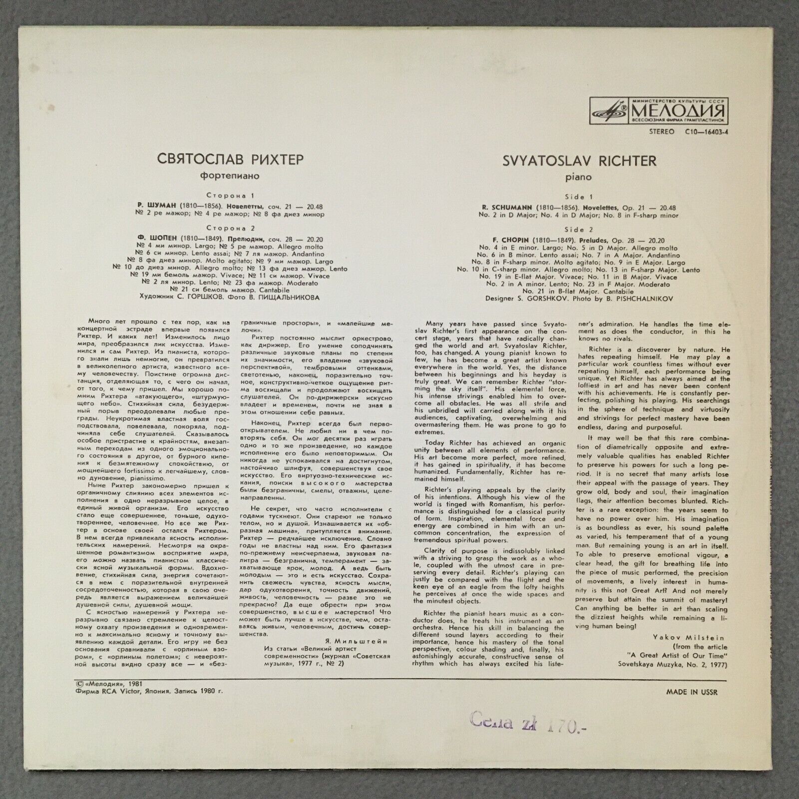 S331 Chopin Preludes Schumann Noveletten Richter Melodiya C10-16403-4 Stereo