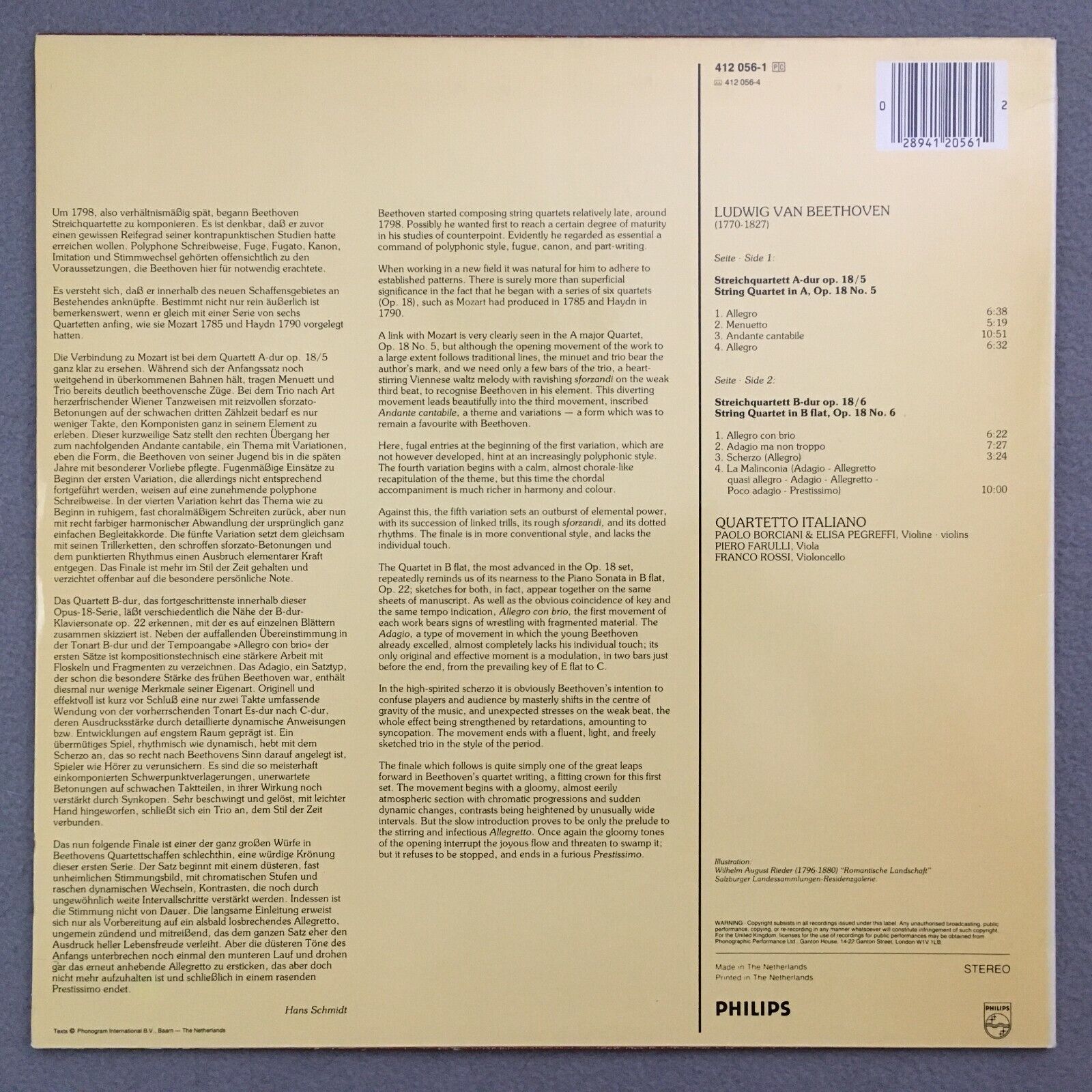 S793 Beethoven String Quartets Quartetto Italiano Philips 412 056-1 Stereo