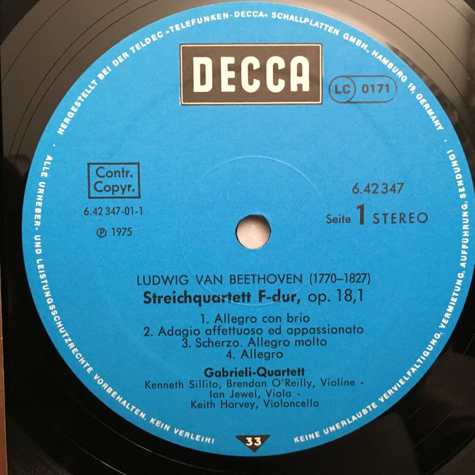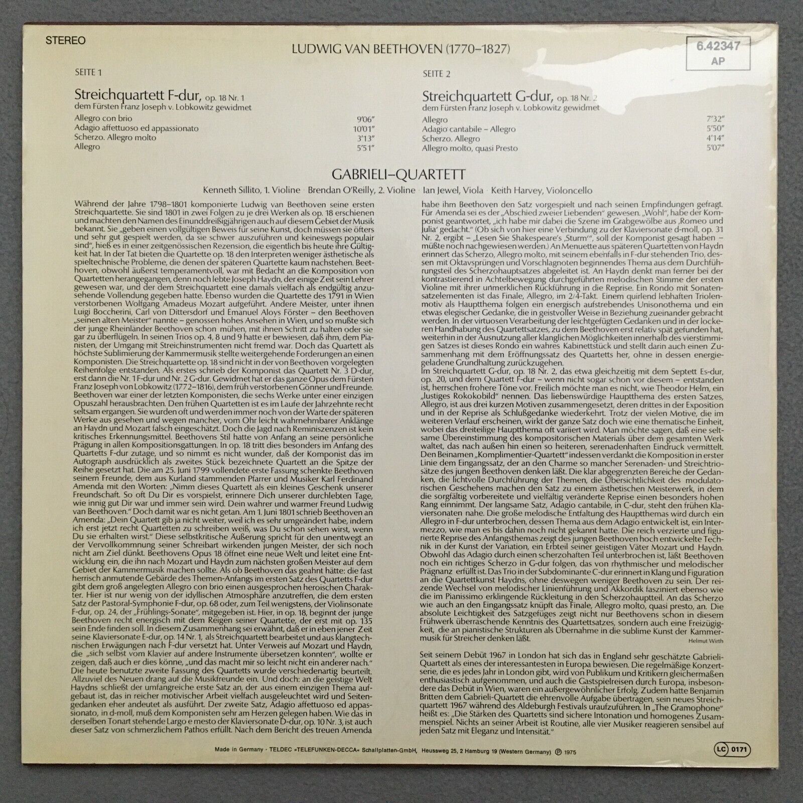 S776 Beethoven String Quartets Gabrieli Quartet DECCA 6.42347 AP Stereo