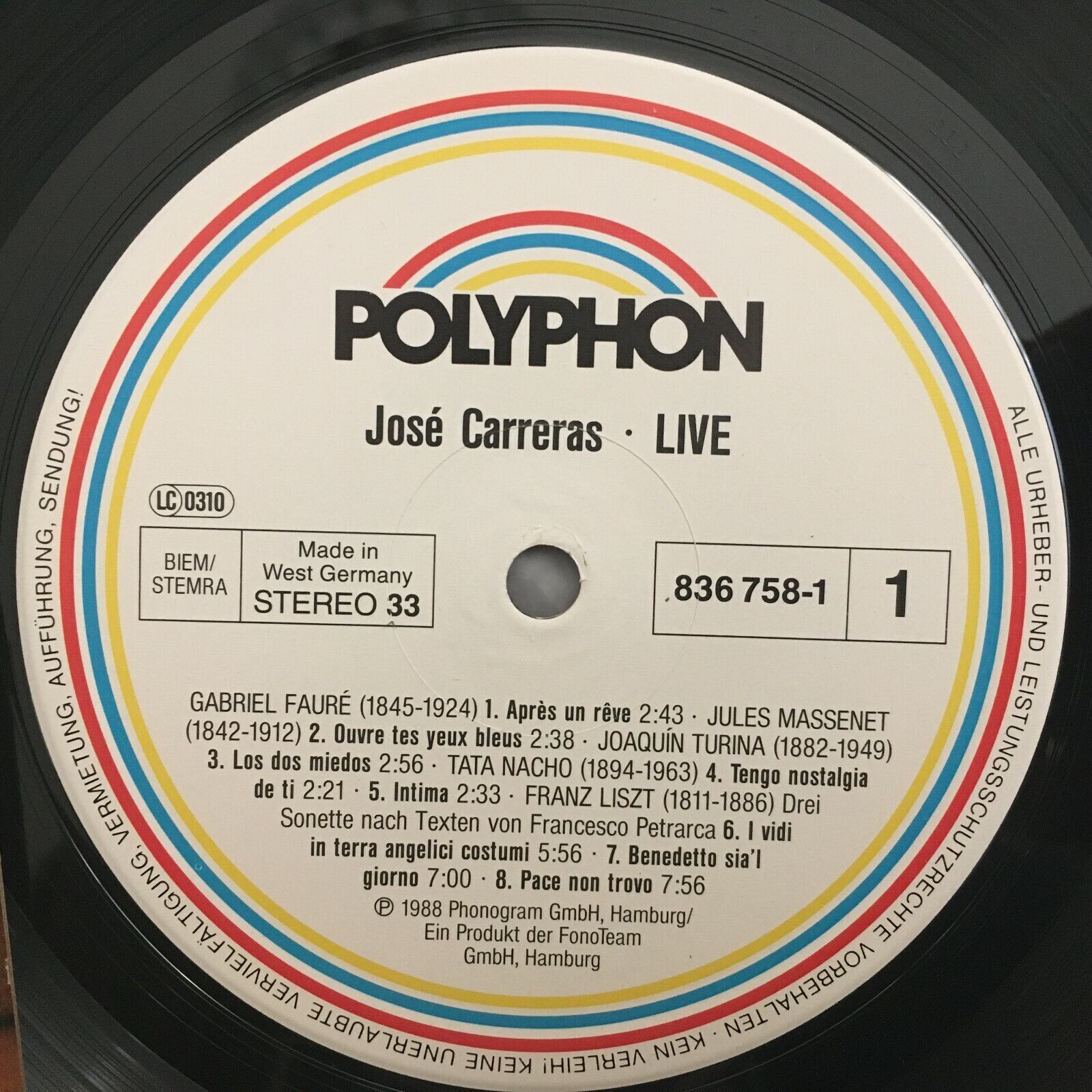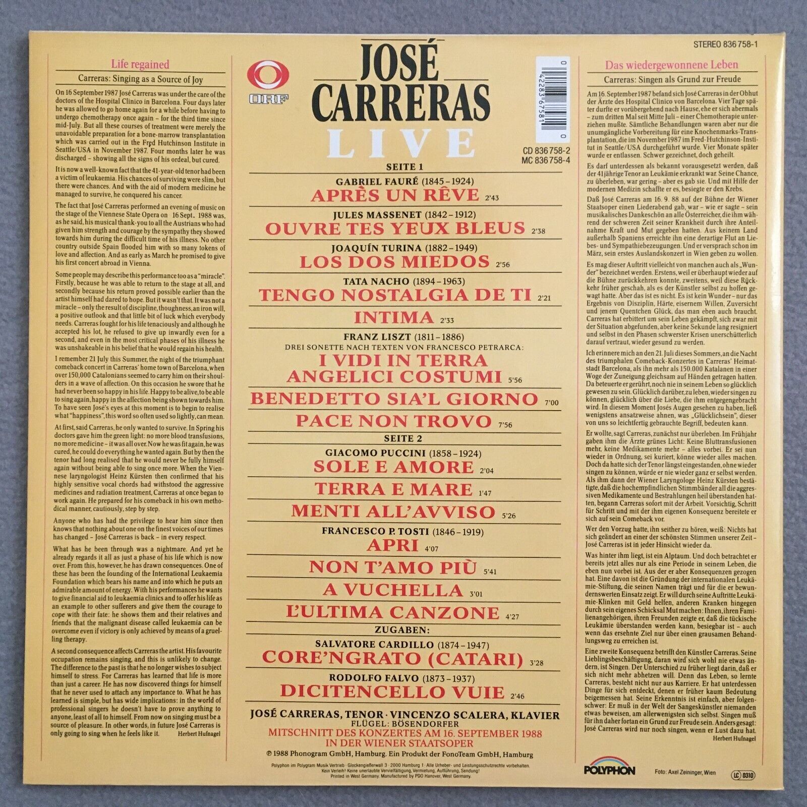 R590 Carreras LIVE Vienna State Opera Scalera Piano Polyphon 836 758-1 Stereo