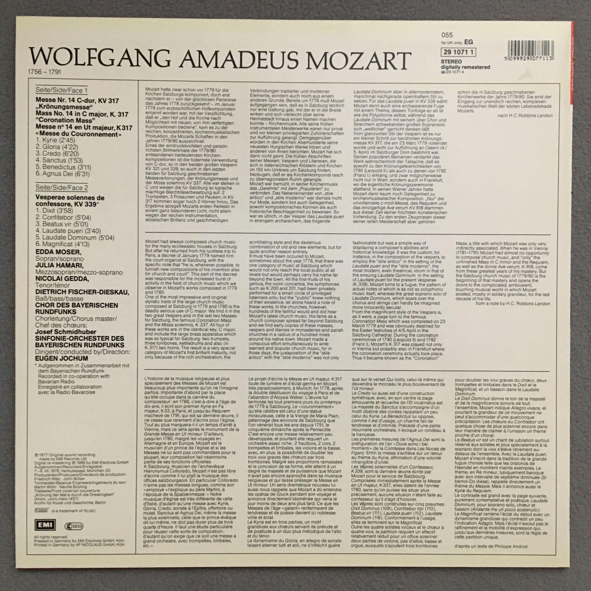 N551 Mozart Coronation Mass Fischer-Dieskau Jochum EMI 29 1071 1 Digital Stereo