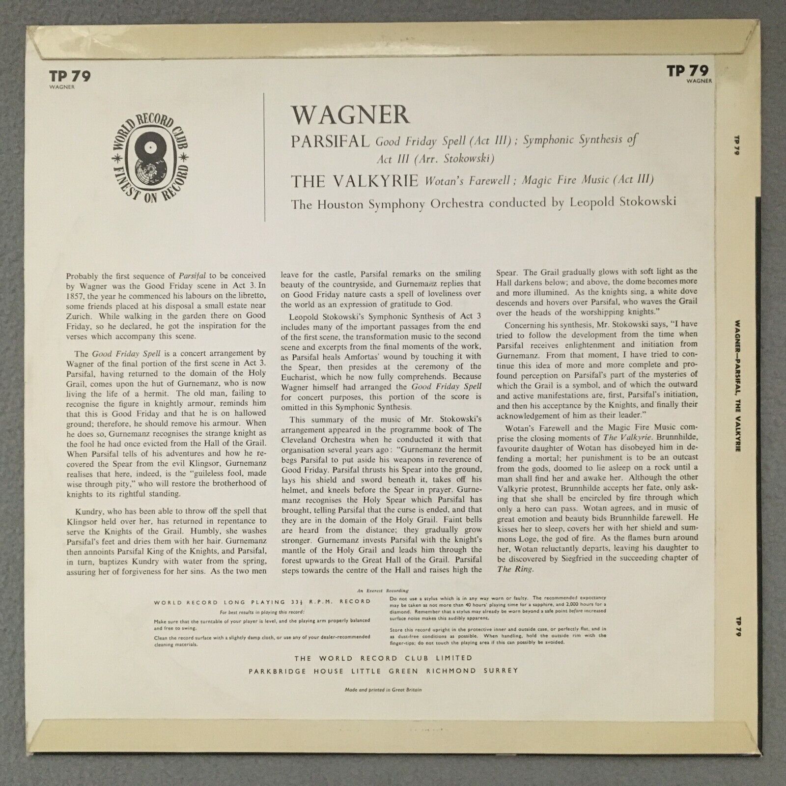 S310 Stokowski conducts Wagner Parsifal Valkyrie World Record Club TP 79