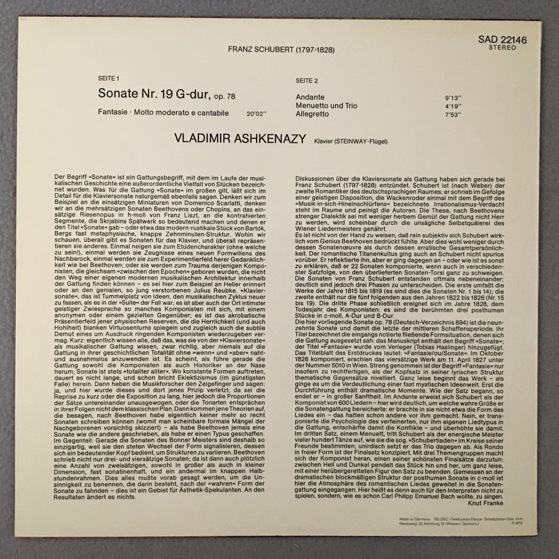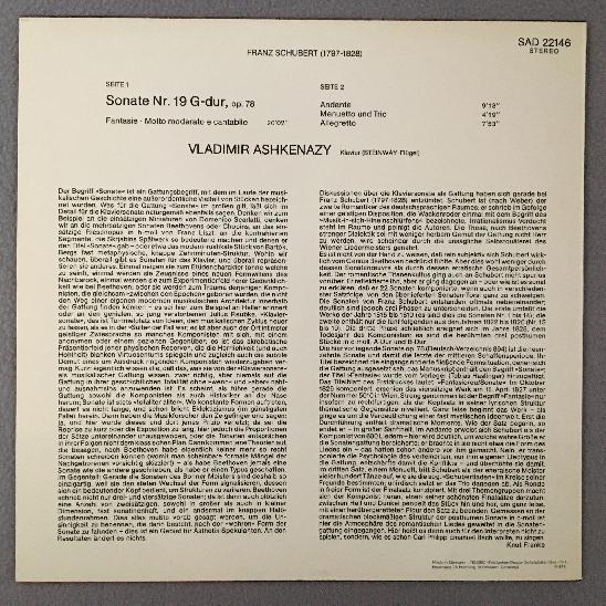 R606 Schubert Sonata No.19 Ashkenazy DECCA SAD 22146 Stereo