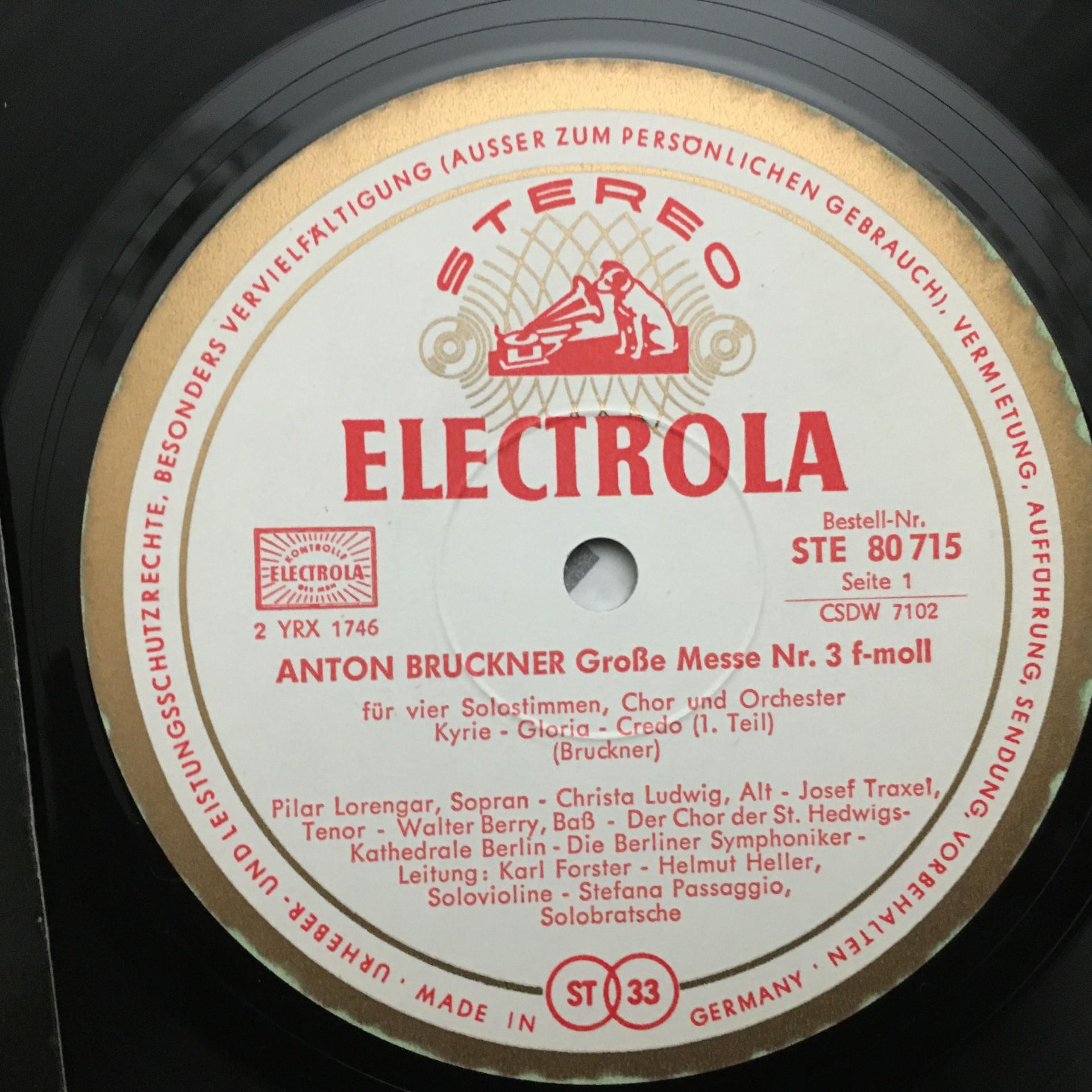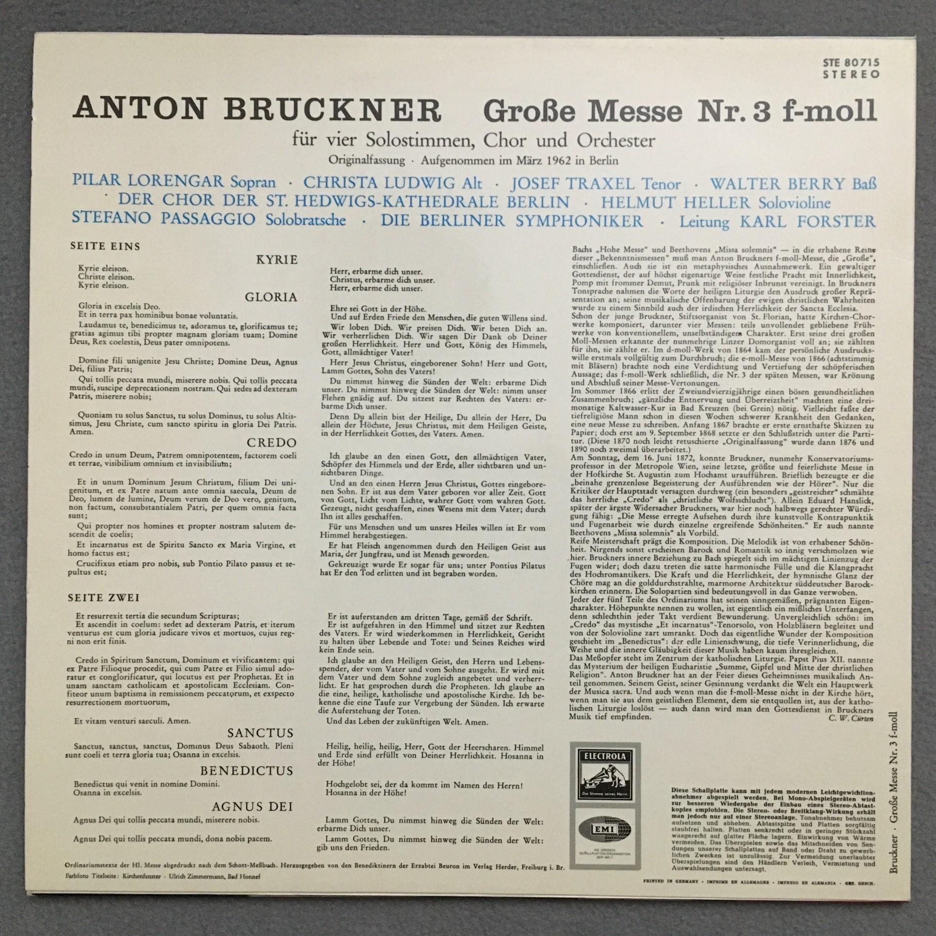 N613 Bruckner Great Mass Lorengar Ludwig Forster Electrola w/g E 80 715 Stereo