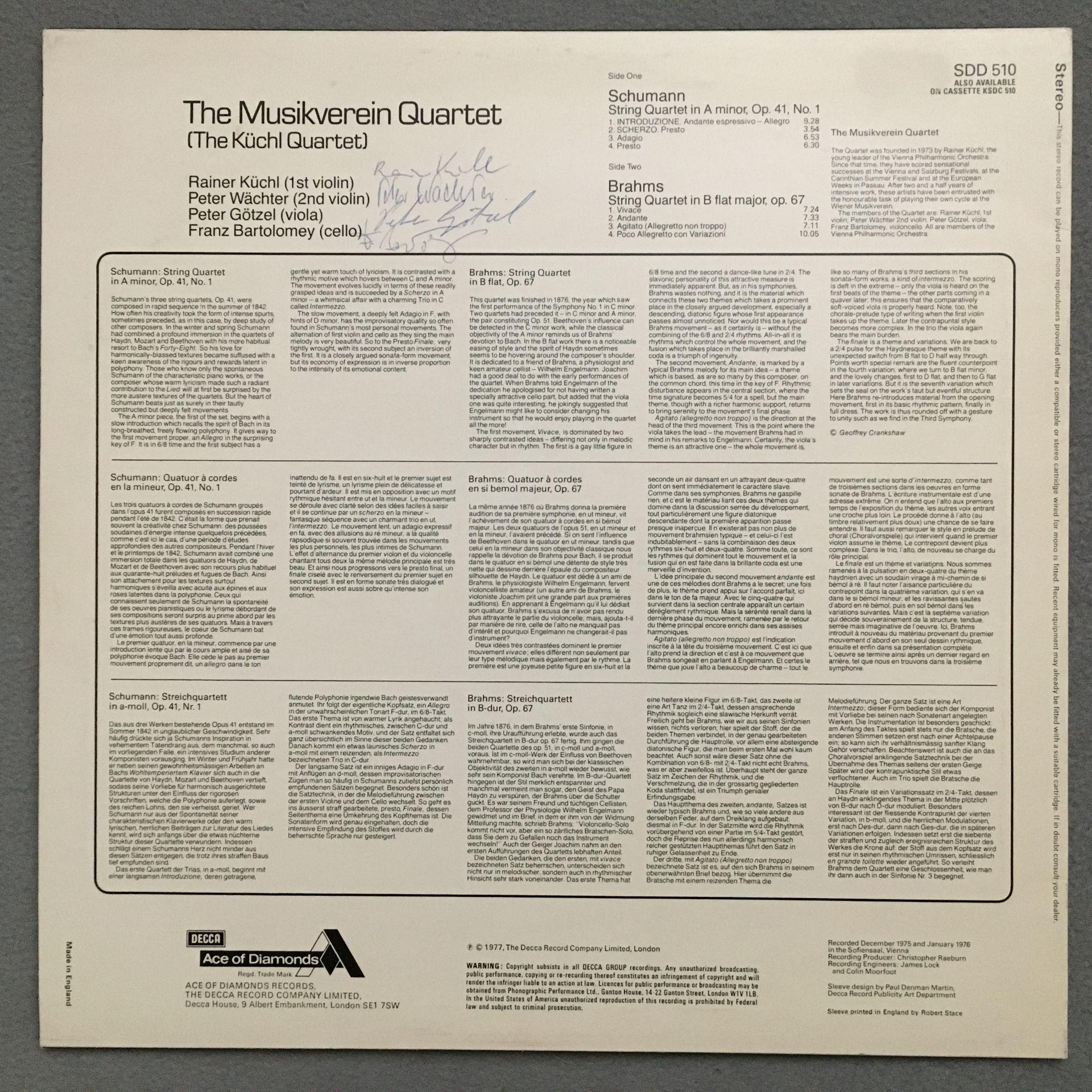 N630 Schumann Brahms Quartets Küchl Quartet Ace of Diamonds SDD 510 St Signed