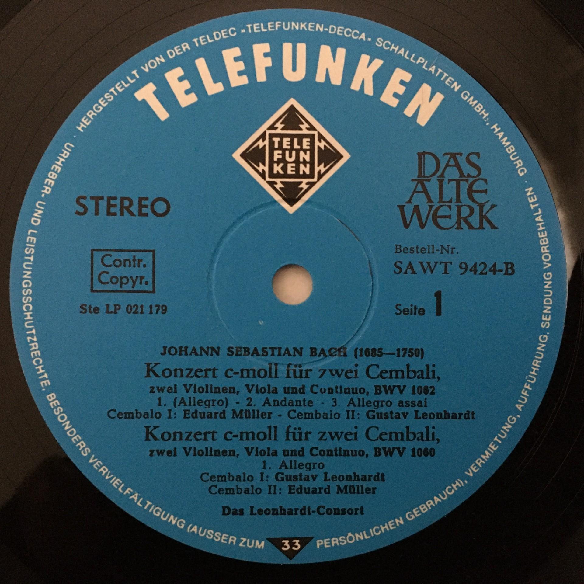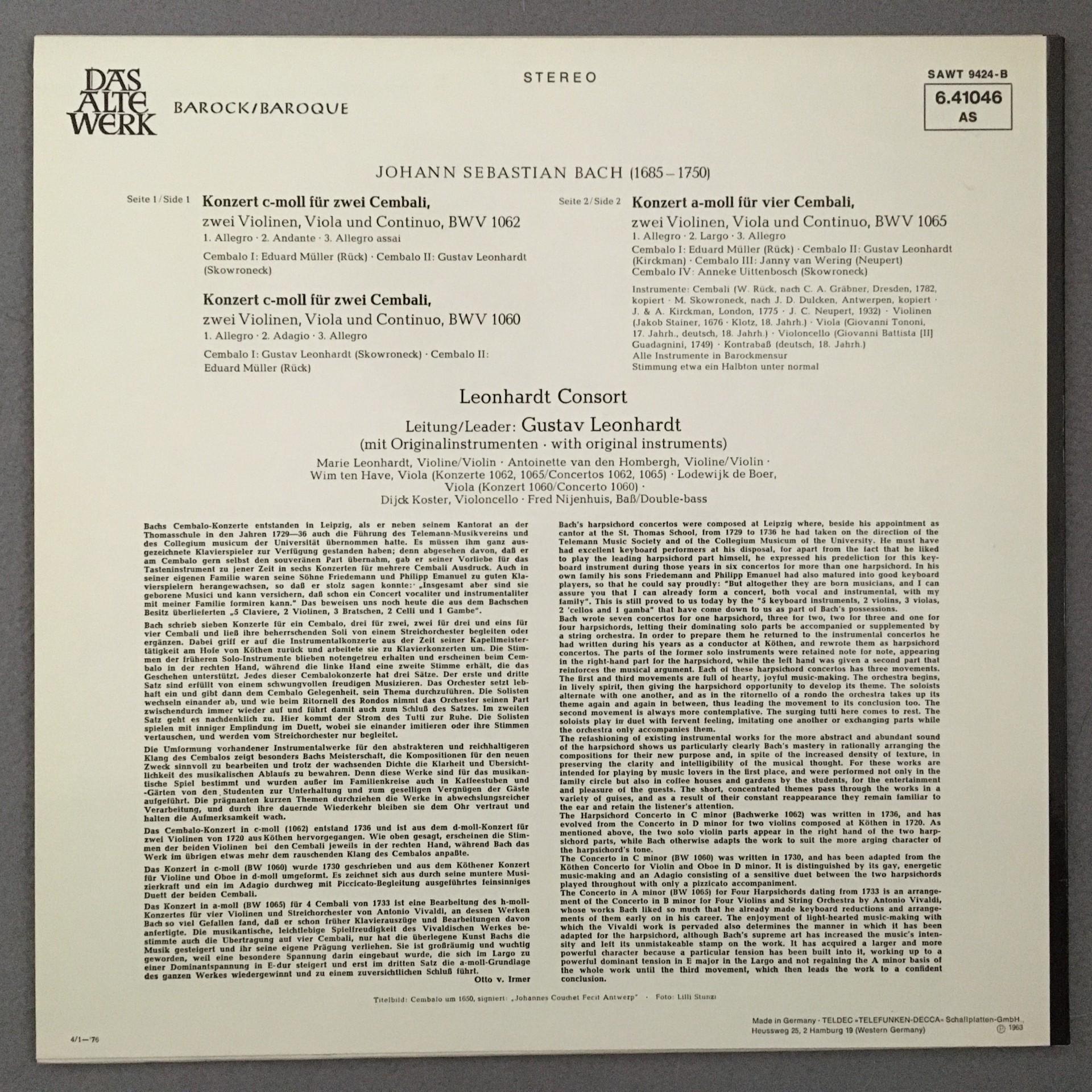 N649 Bach Harpsichord Concertos Leonhardt Consort Telefunken 6.41046 AS Stereo