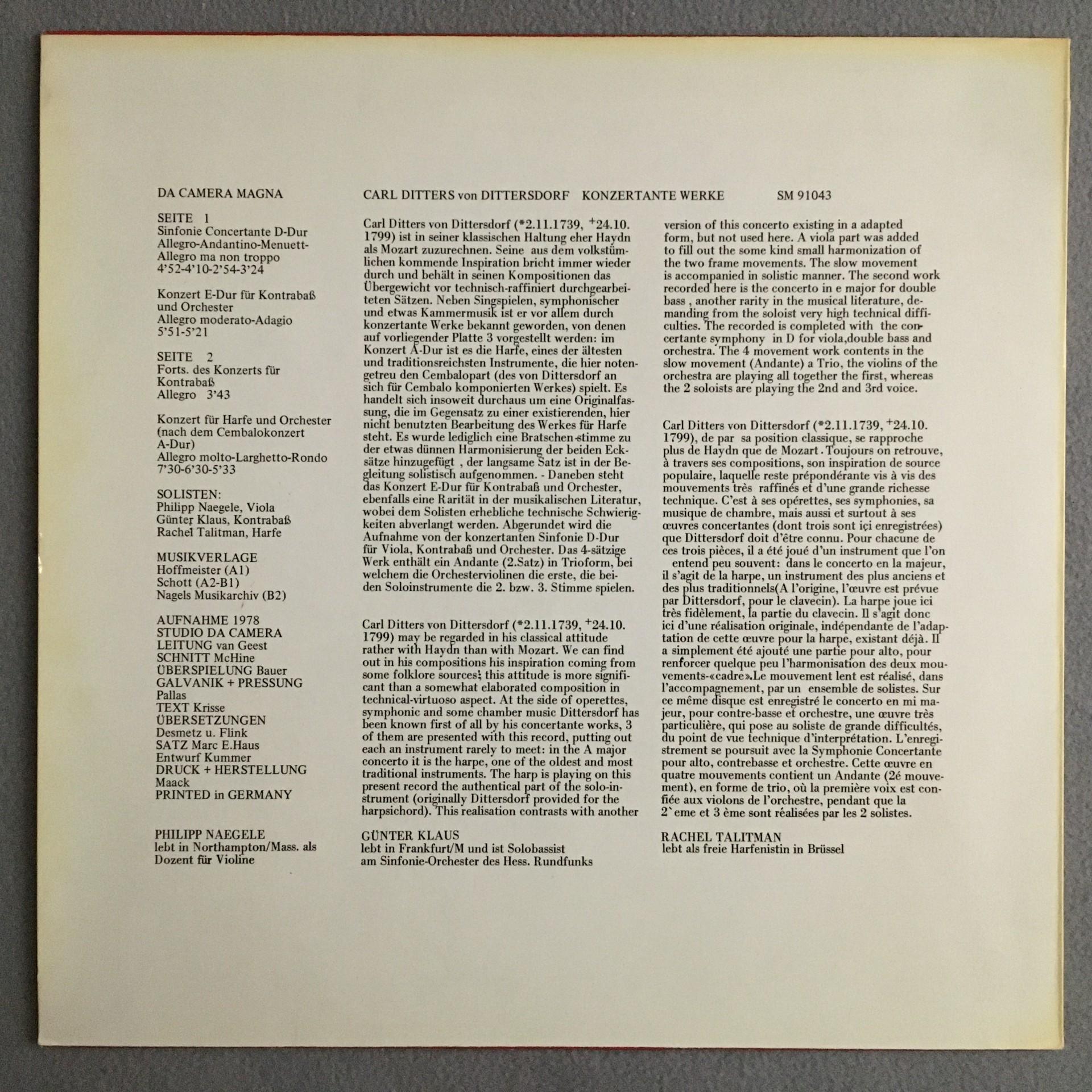 N684 Ditters Concertos Symphony Talitman Klaus Da Camera Magna SM 91043 Stereo
