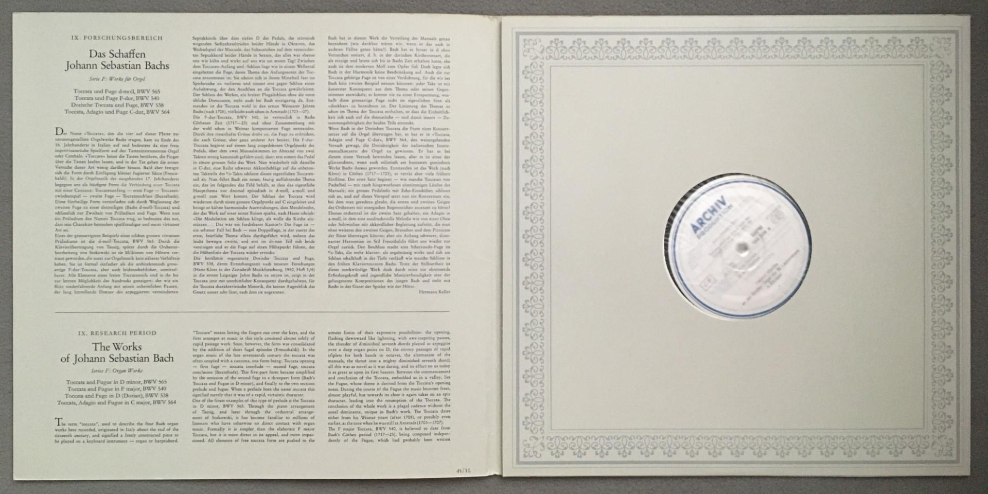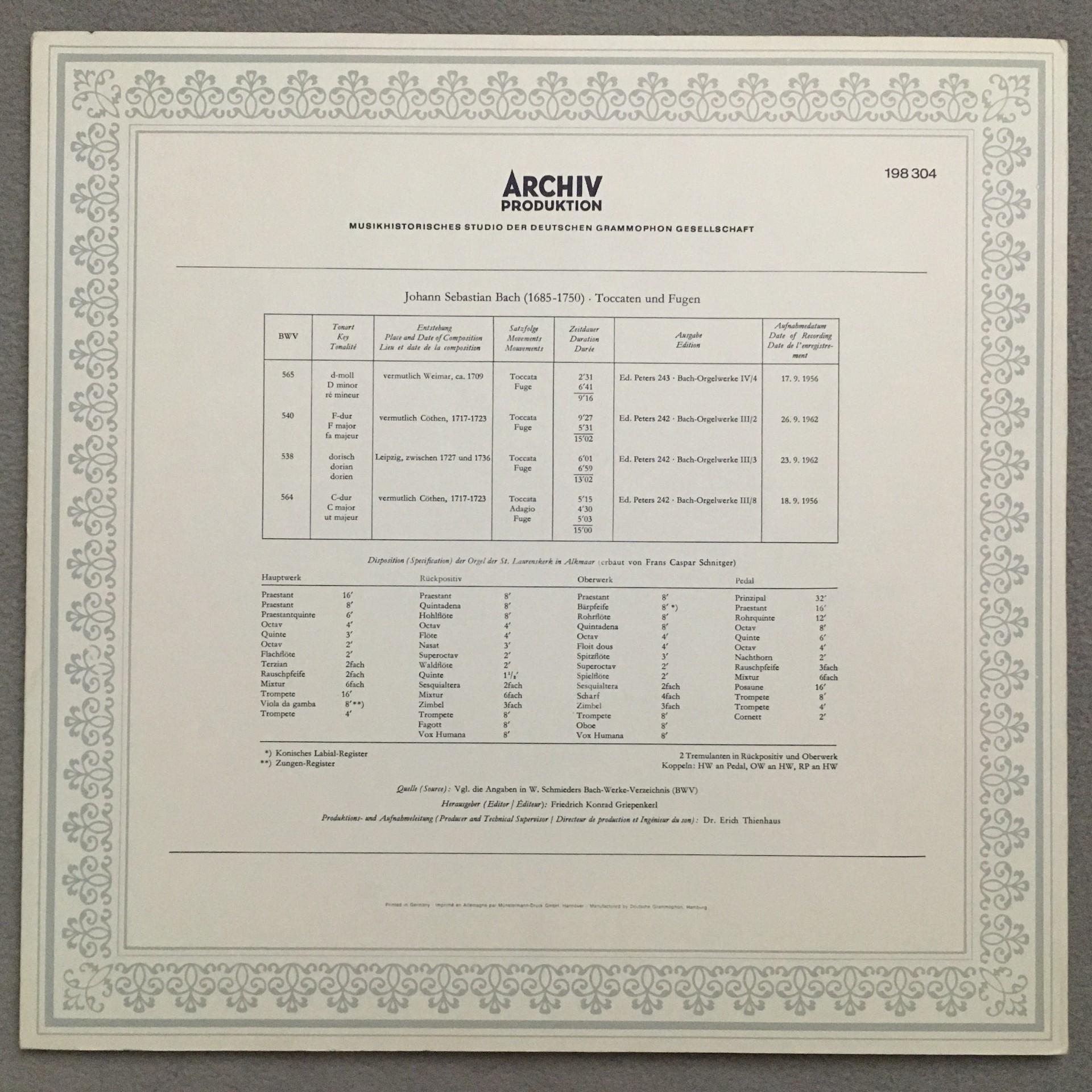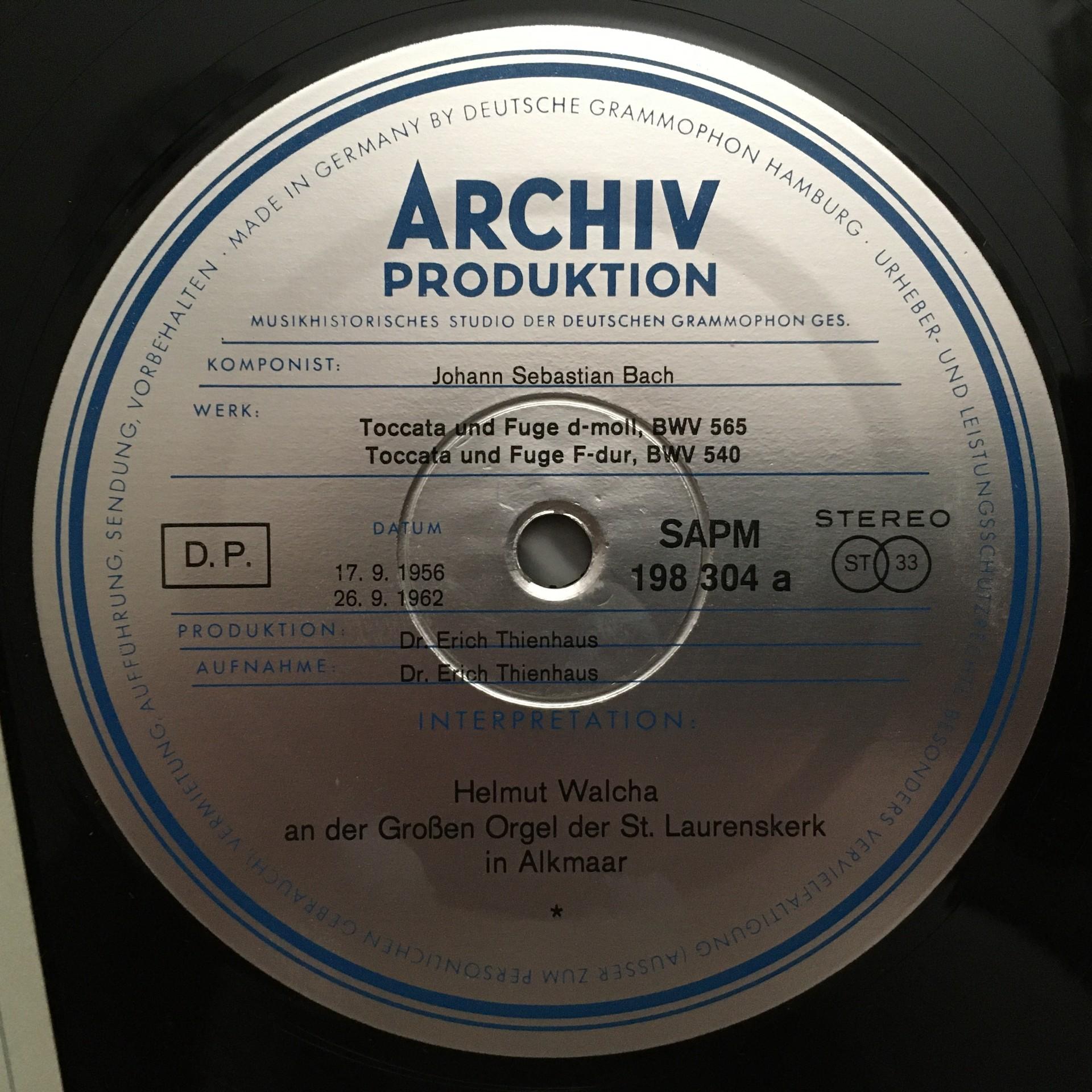N715 Bach Toccatas & Fugues Walcha Organ DGG Archiv 198 304 Stereo