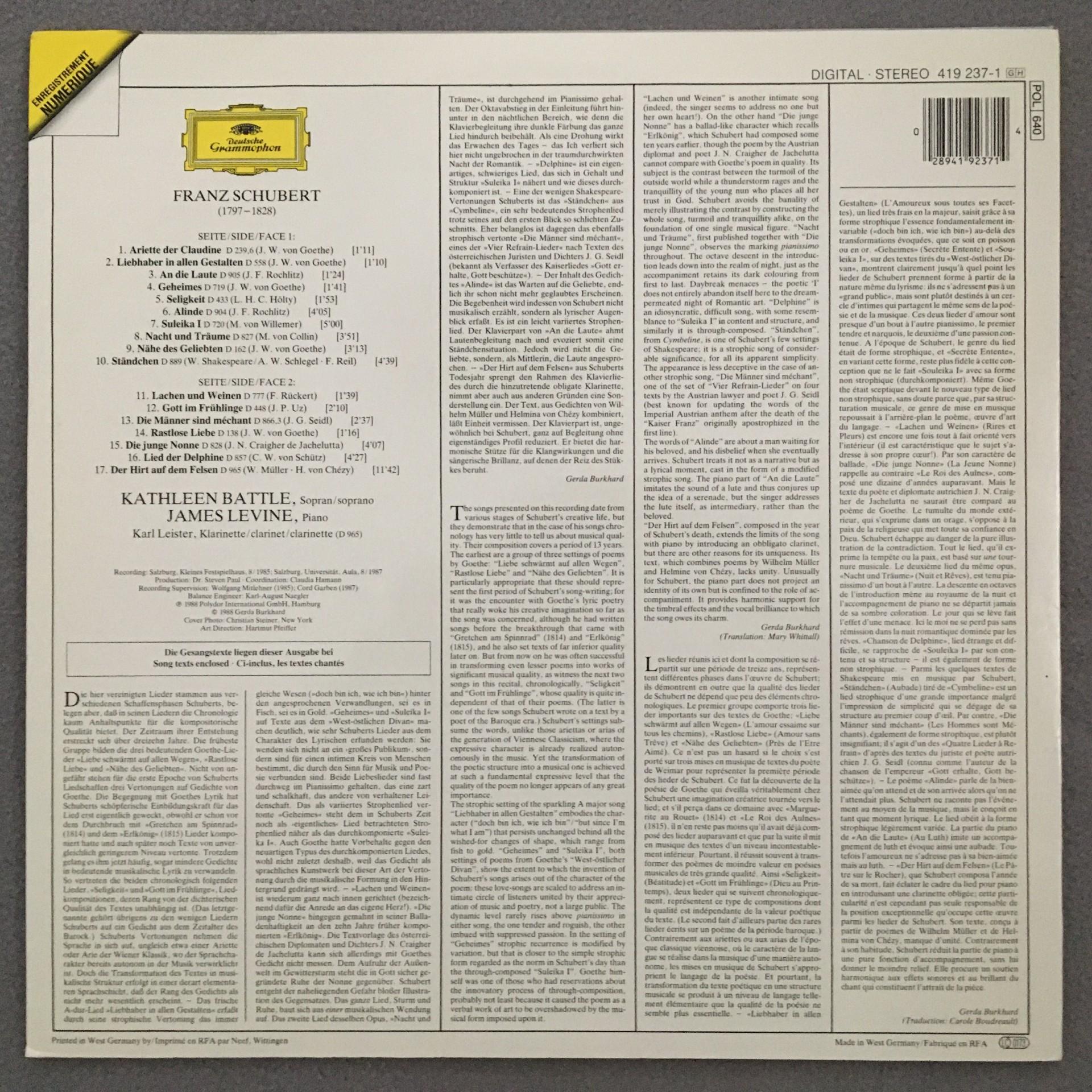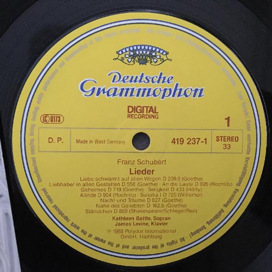 N791 Schubert Songs Battle Leister Levine Piano DGG 419 237-1 Digital Stereo