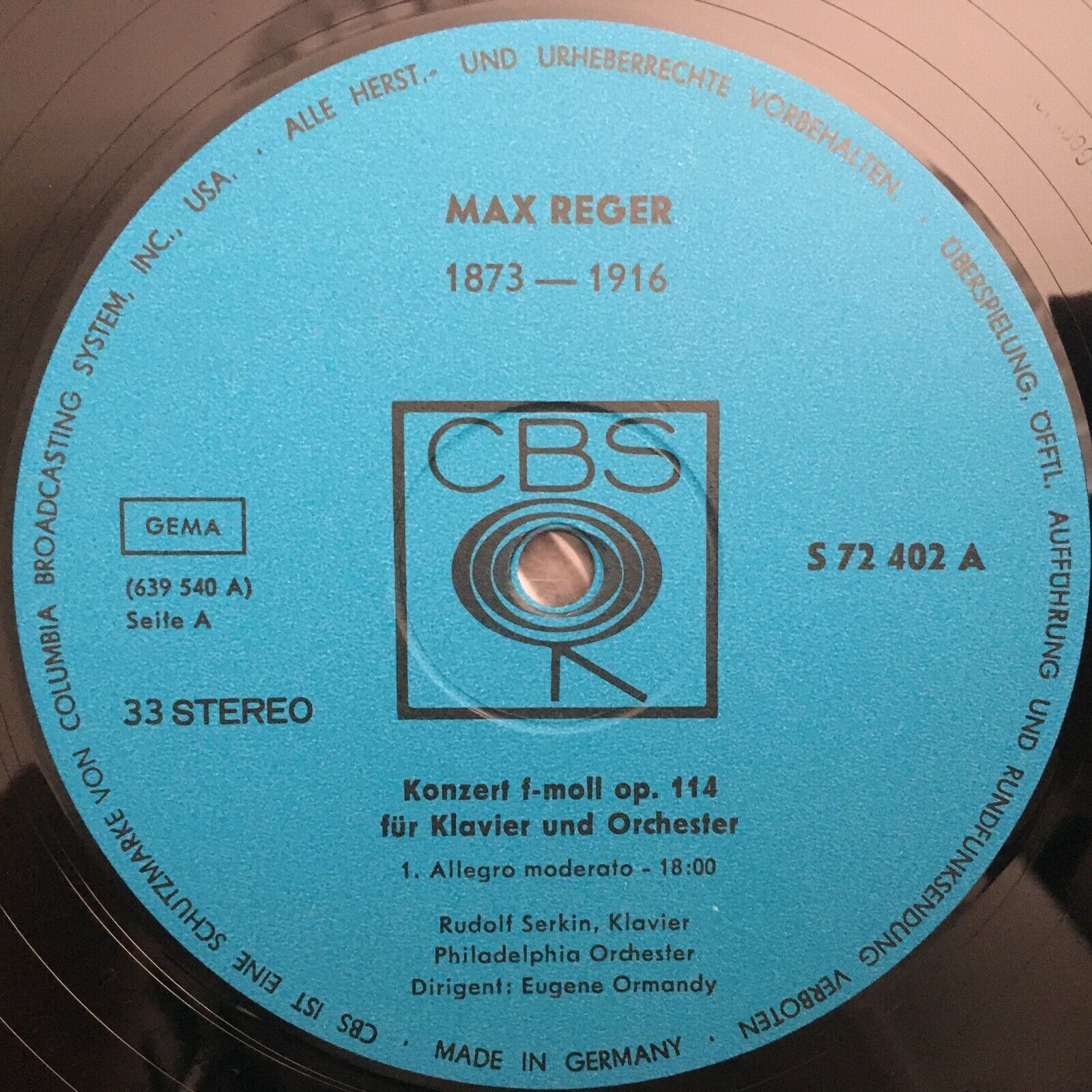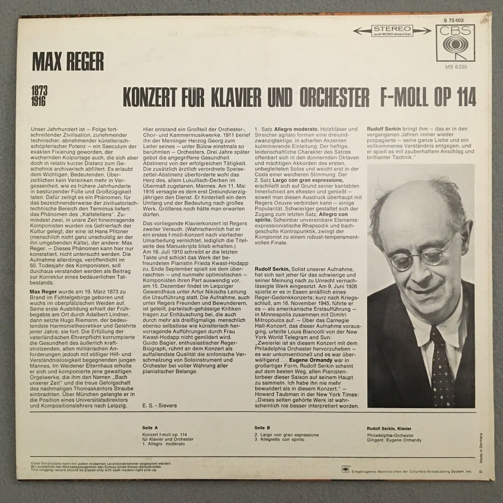 J116 Reger Piano Concerto Serkin Ormandy CBS S 72 402 Stereo