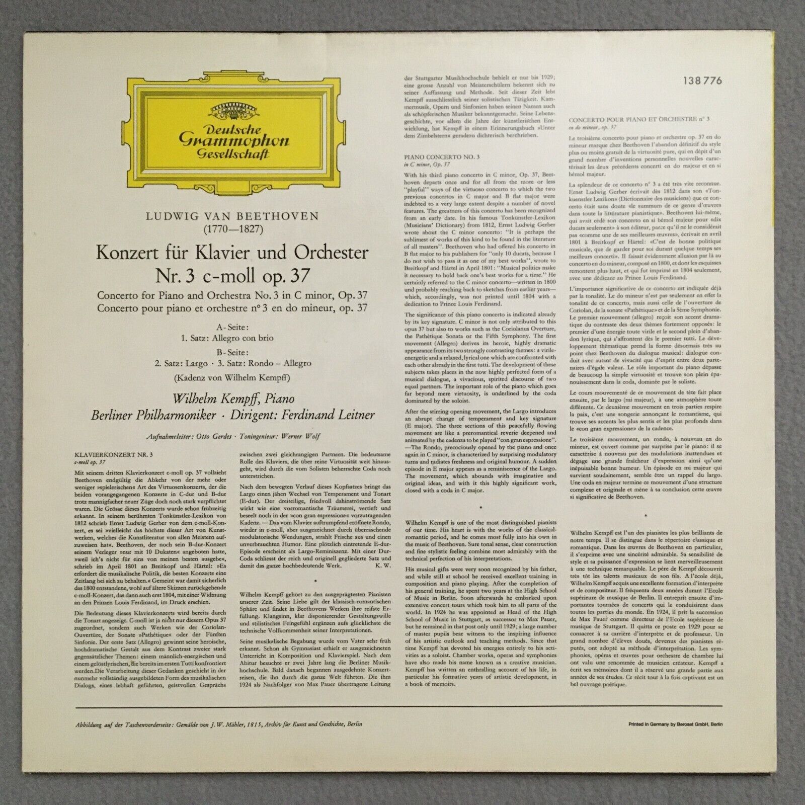 S151 Beethoven Piano Concerto No.3 Kempff Leitner BPO DGG 138 776 Stereo
