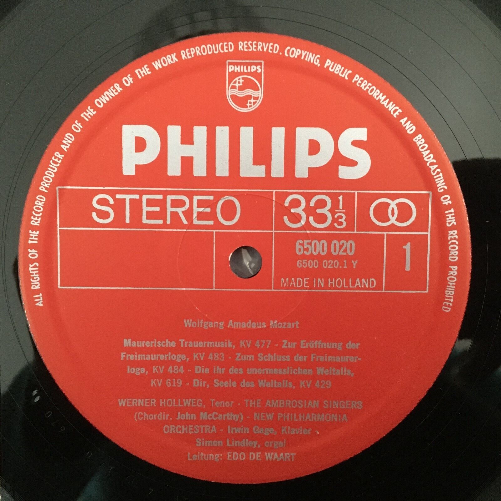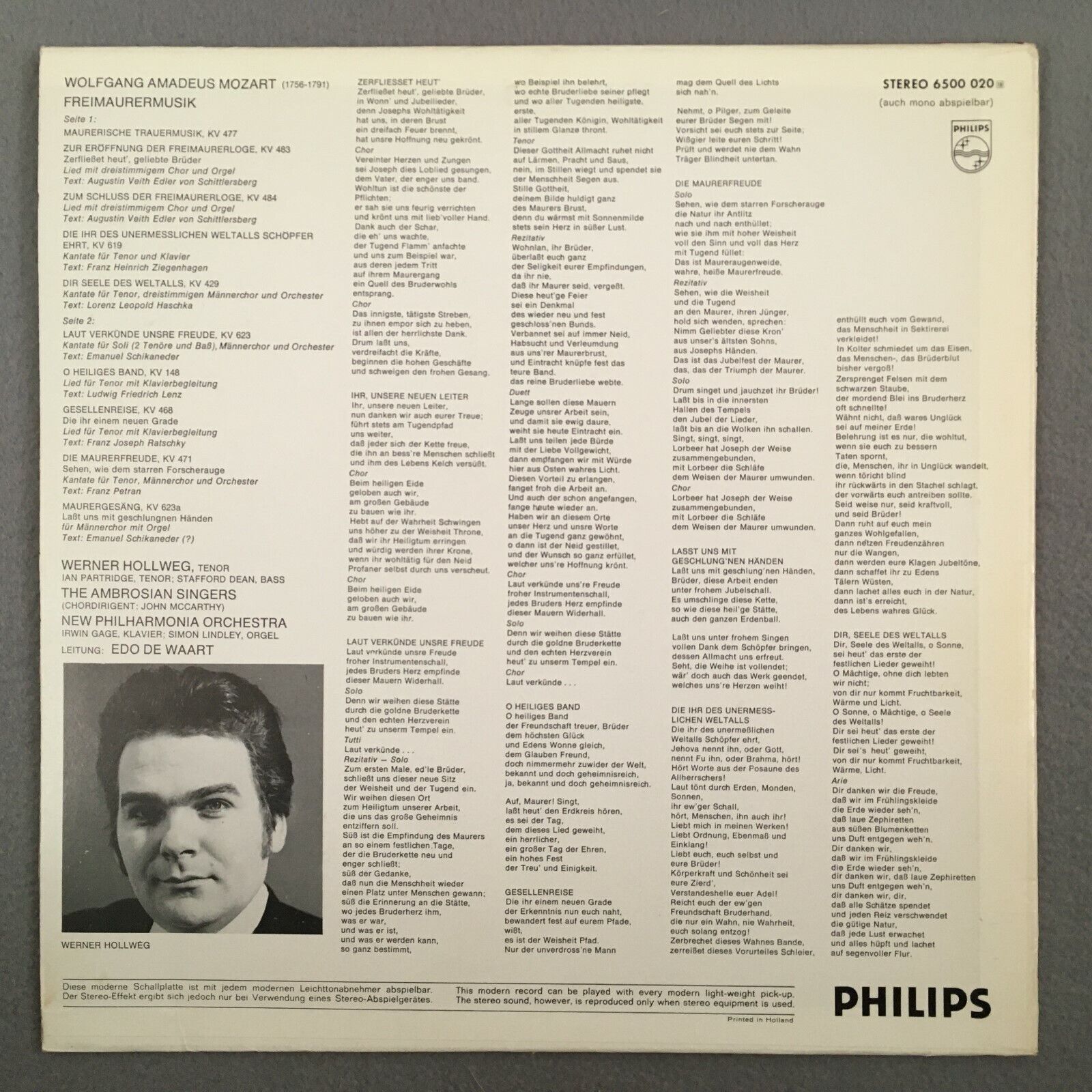 Z938 Mozart Masonic Music Hollweg De Waart Philips 6500 020 Stereo