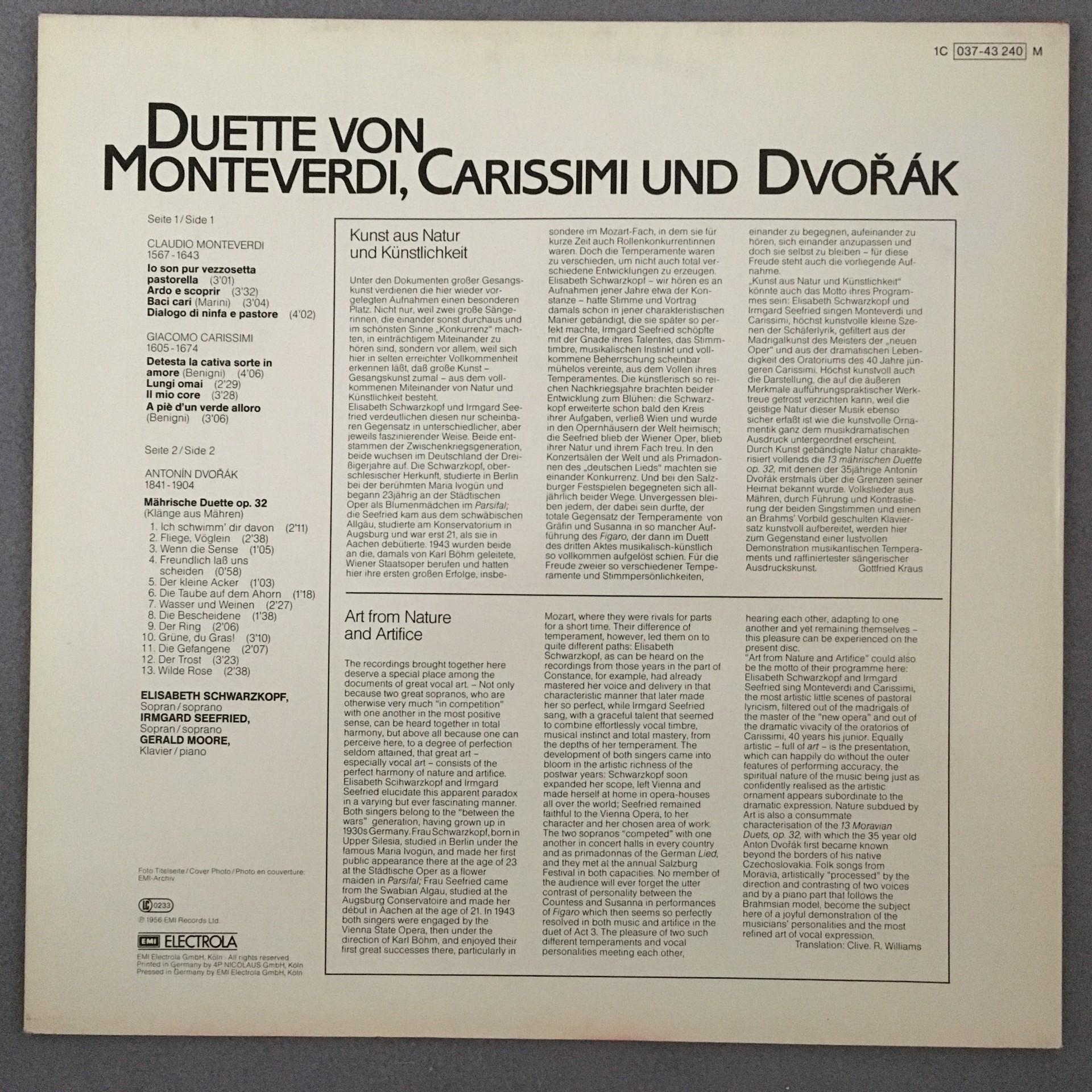 N926 Duets from Monteverdi Dvorak Seefried Schwarzkopf Moore EMI 1C 037-43 240