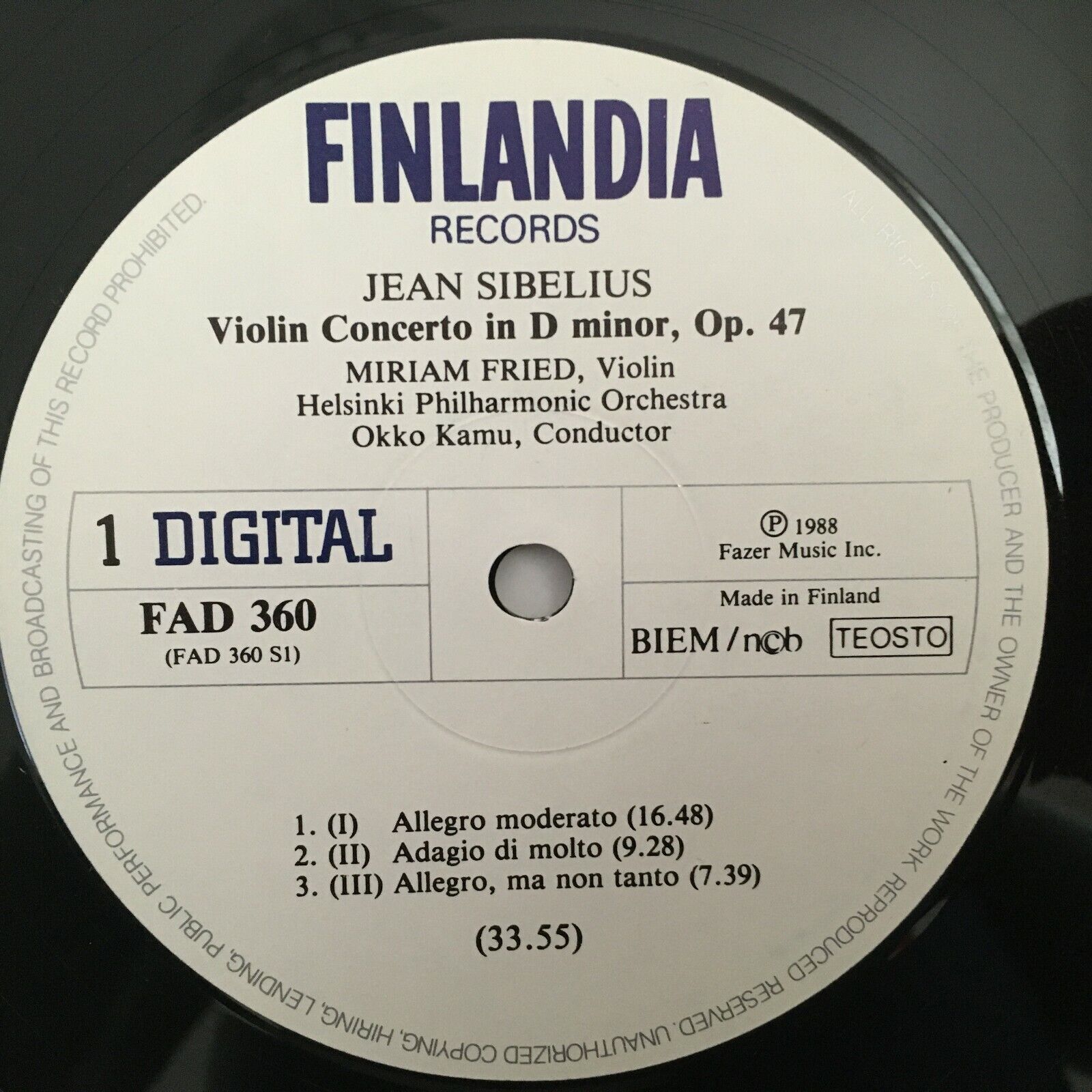 Y734 Sibelius Violin Concerto Suite Fried Kamu Finlandia FAD 360 Digital Stereo
