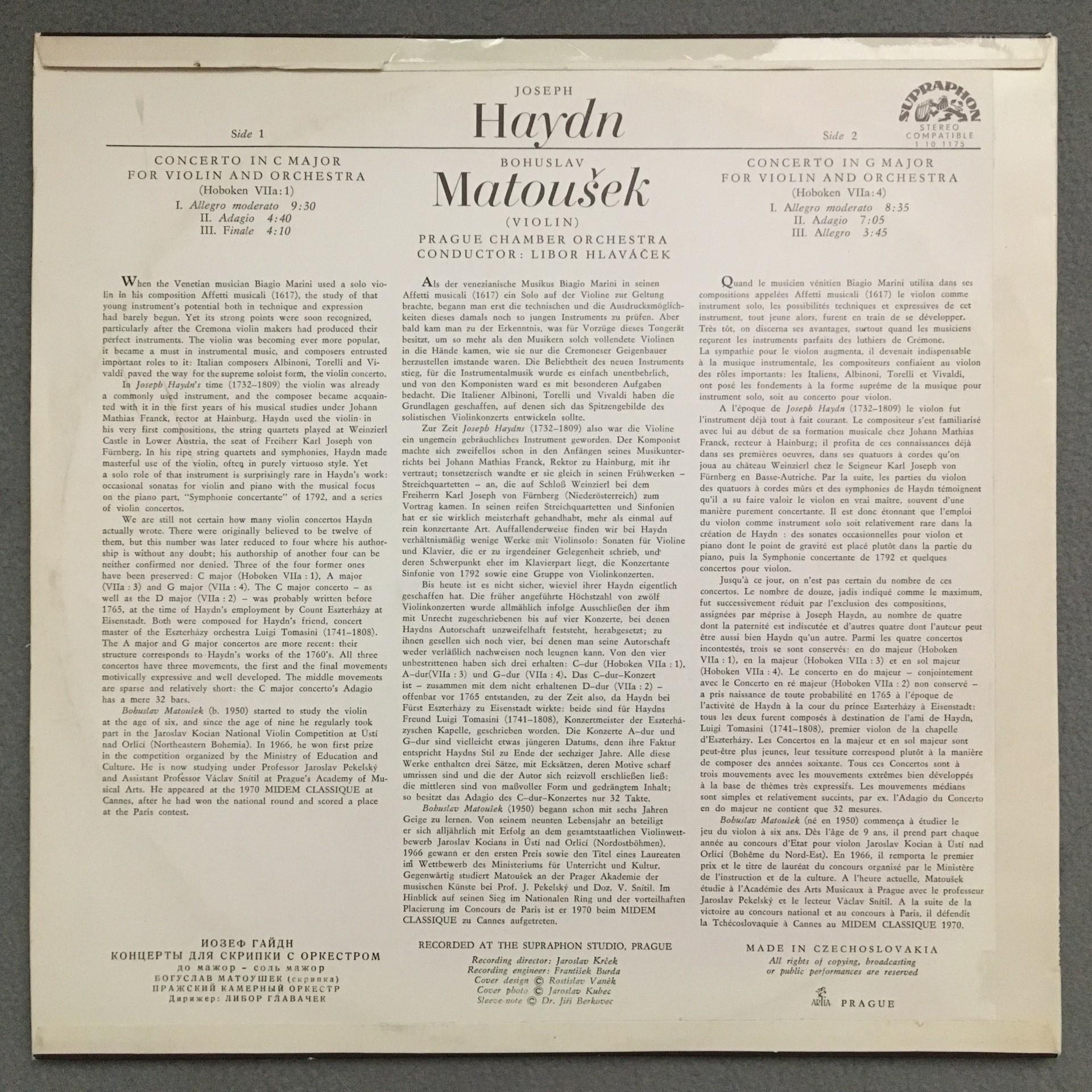 O066 Haydn Violin Concertos Matousek Hlavacek Supraphon 1 10 1175 Stereo