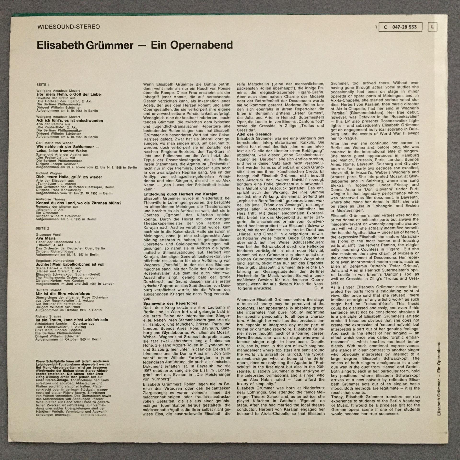 O160 Grümmer Night of Opera Mozart Verdi Wagner Dacapo 1 C 047-28 553 Stereo