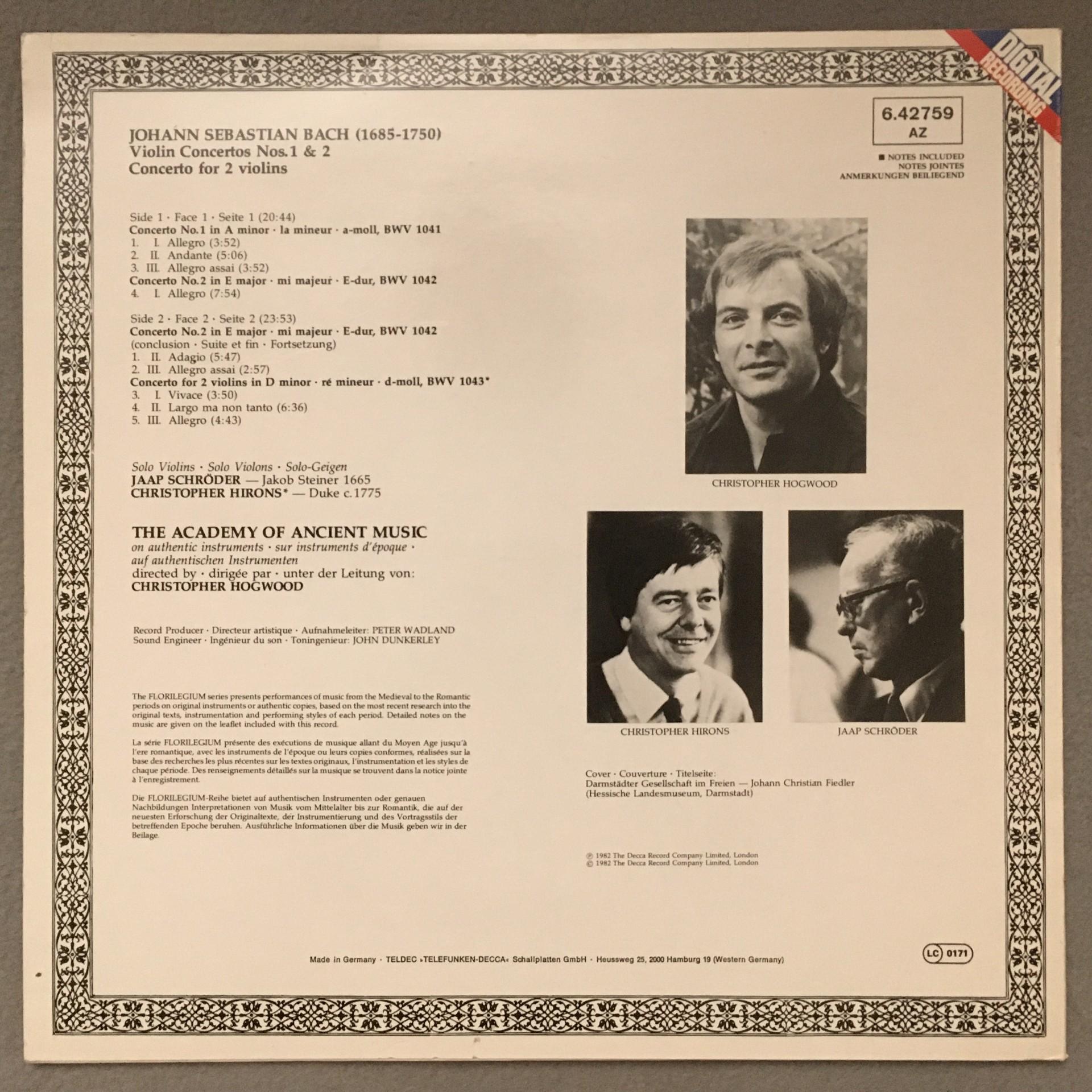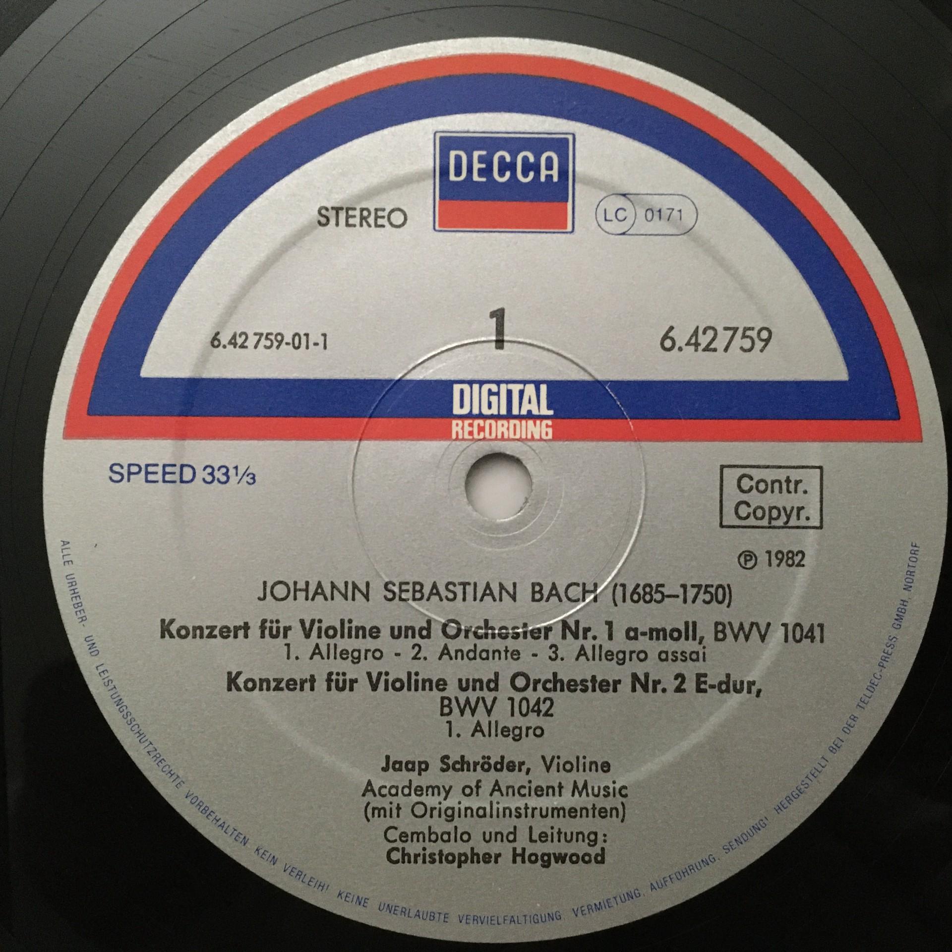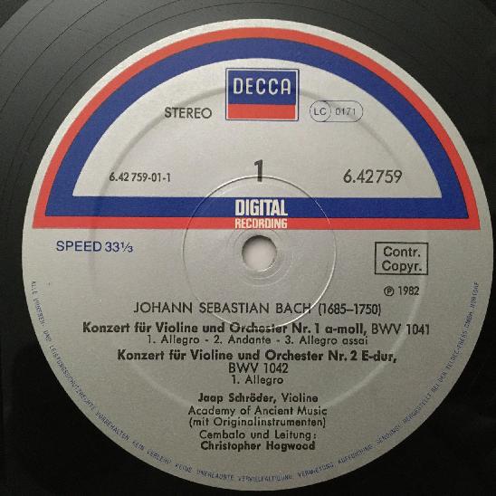 O281 Bach Violin Concertos Schröder Hogwood DECCA 6.42759 AZ Digital Stereo