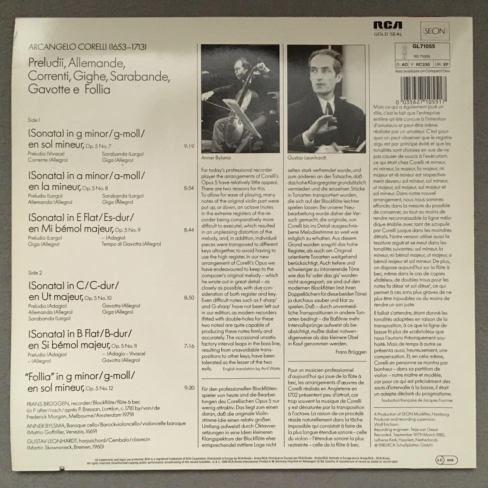 O352 Corelli Sonatas Leonhardt Bylsma Brüggen RCA GL 71055 Stereo