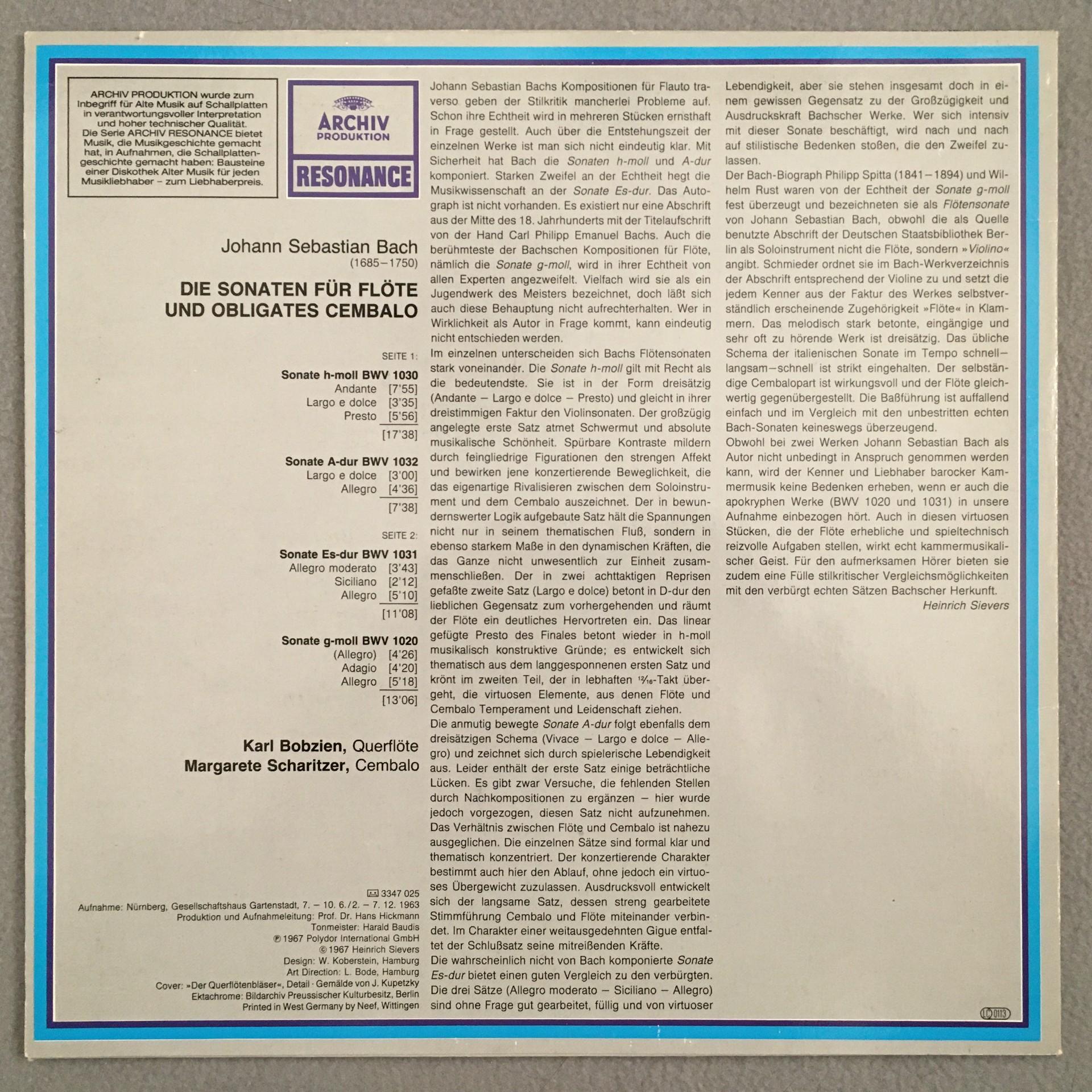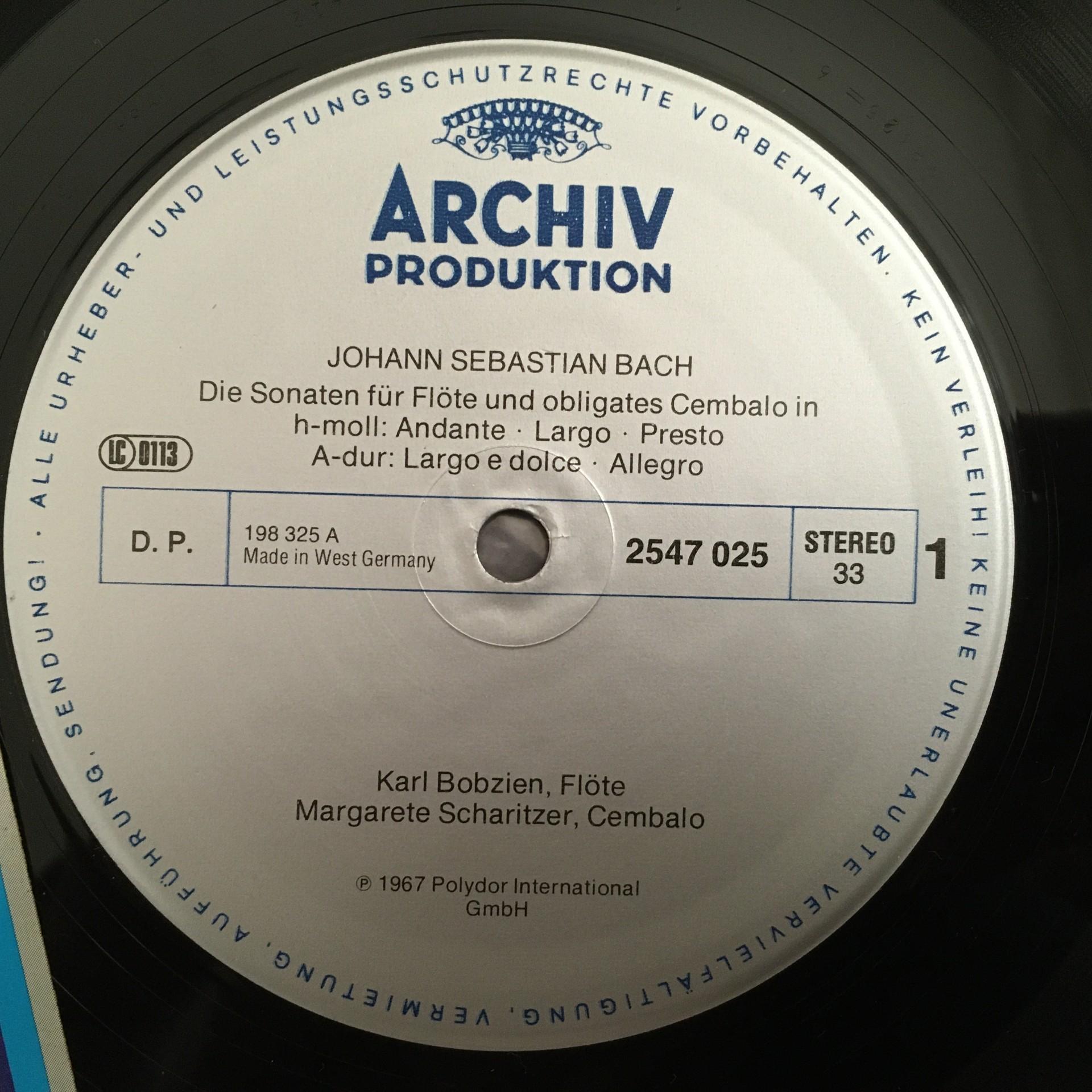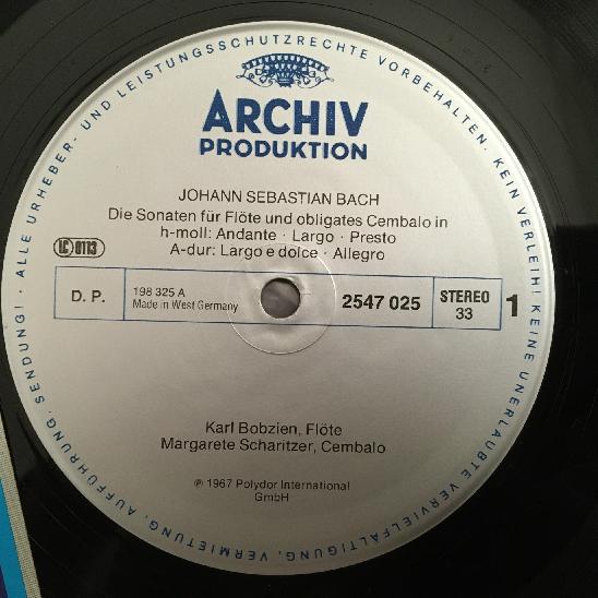 O386 Bach Flute & Harpsichord Sonatas Bobzien Scharitzer DGG Archiv 2547 025 St