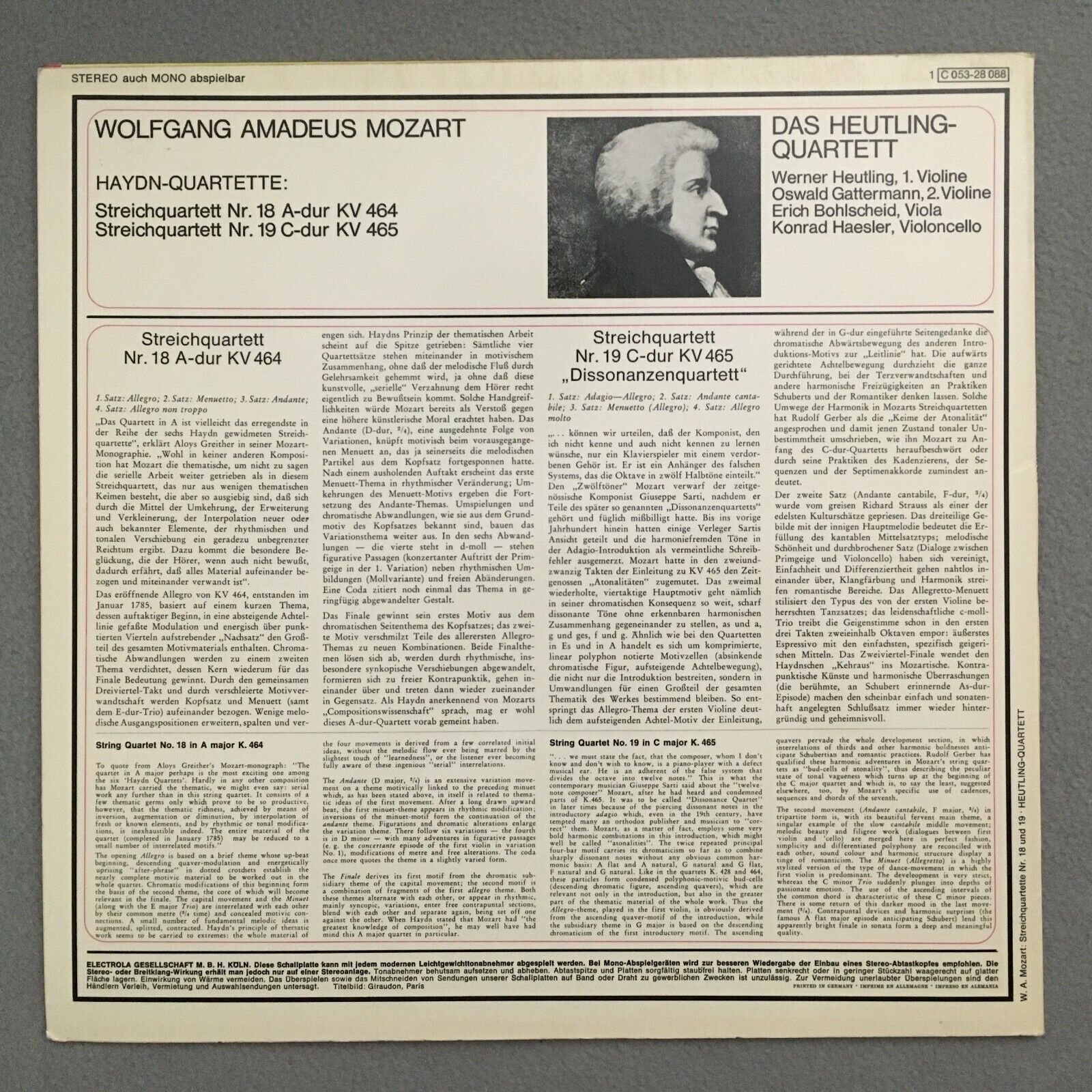 S563 Mozart String Quartets Heutling Quartet Electrola 1 C 053-28 088 Stereo
