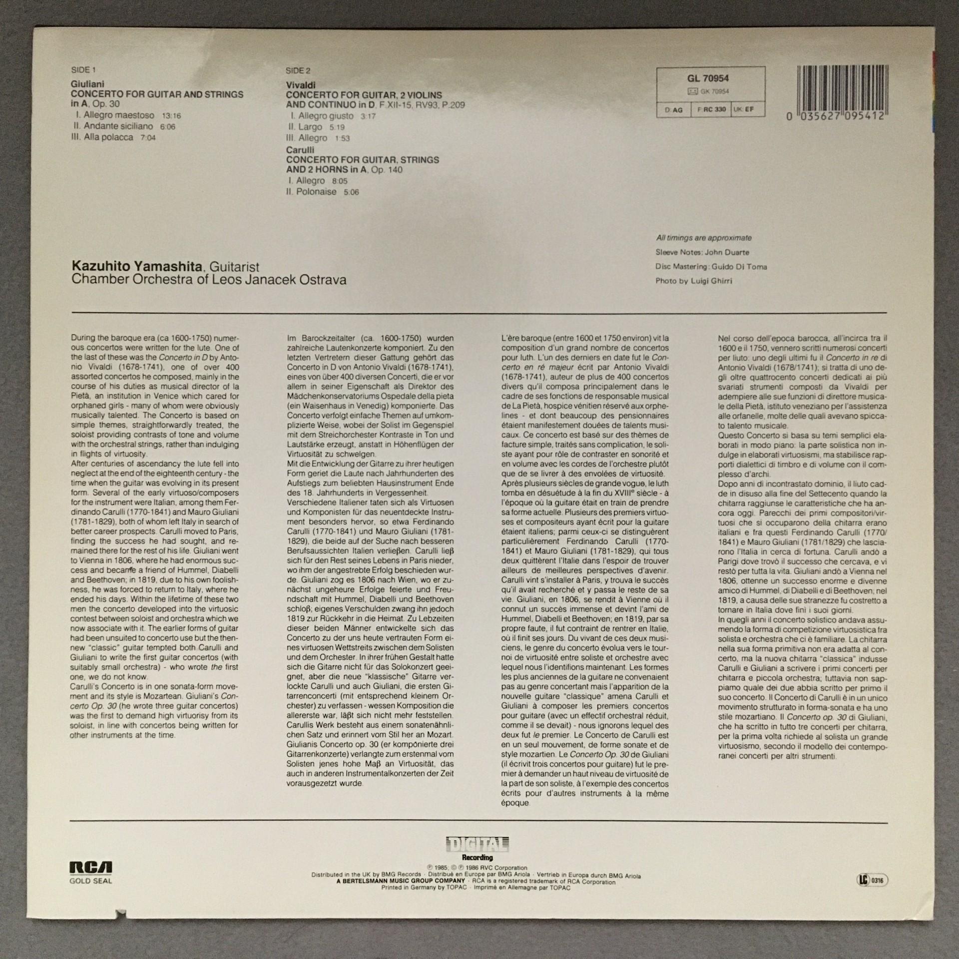 O452 Vivaldi Carulli Guitar Concertos Yamashita RCA GL 70954 Digital Stereo