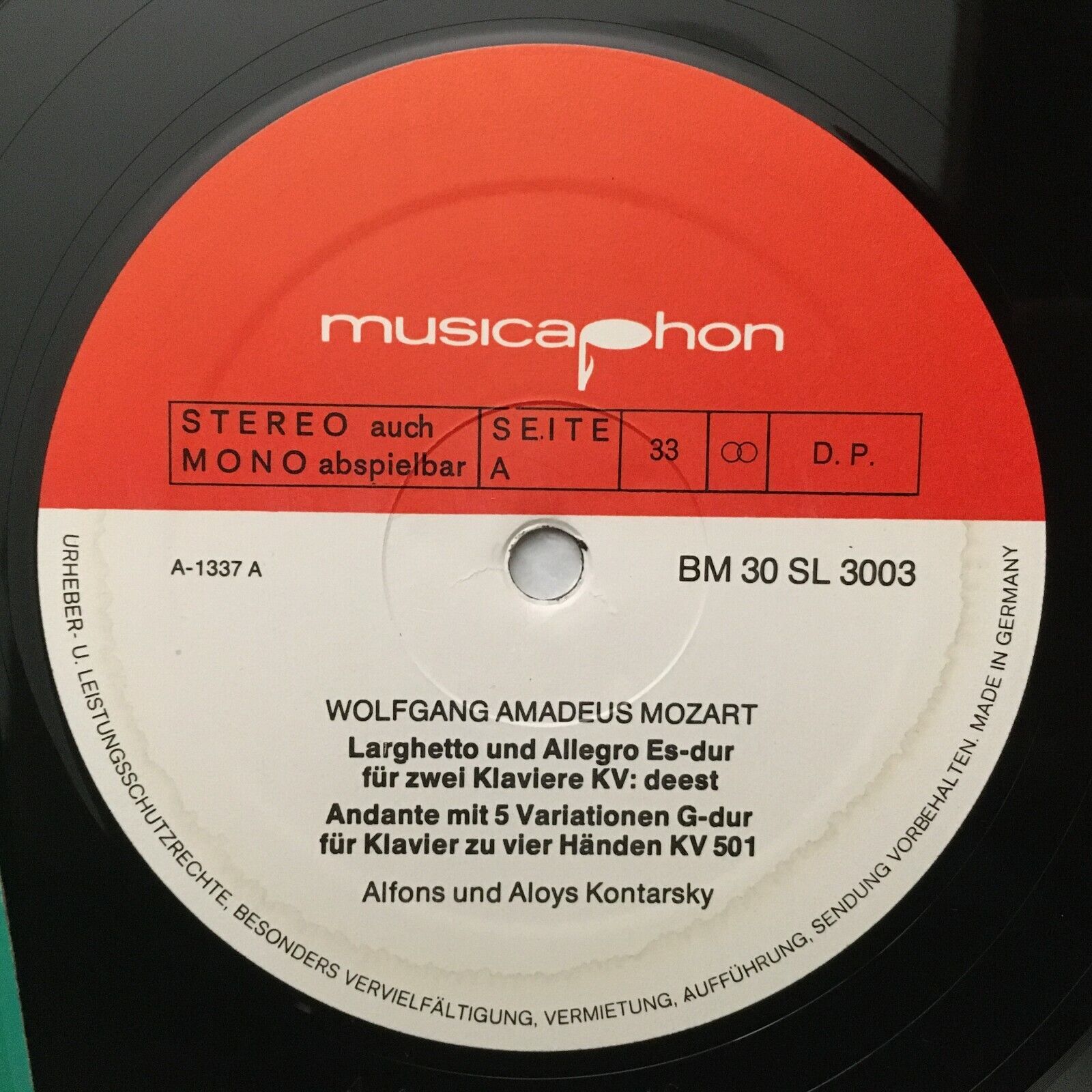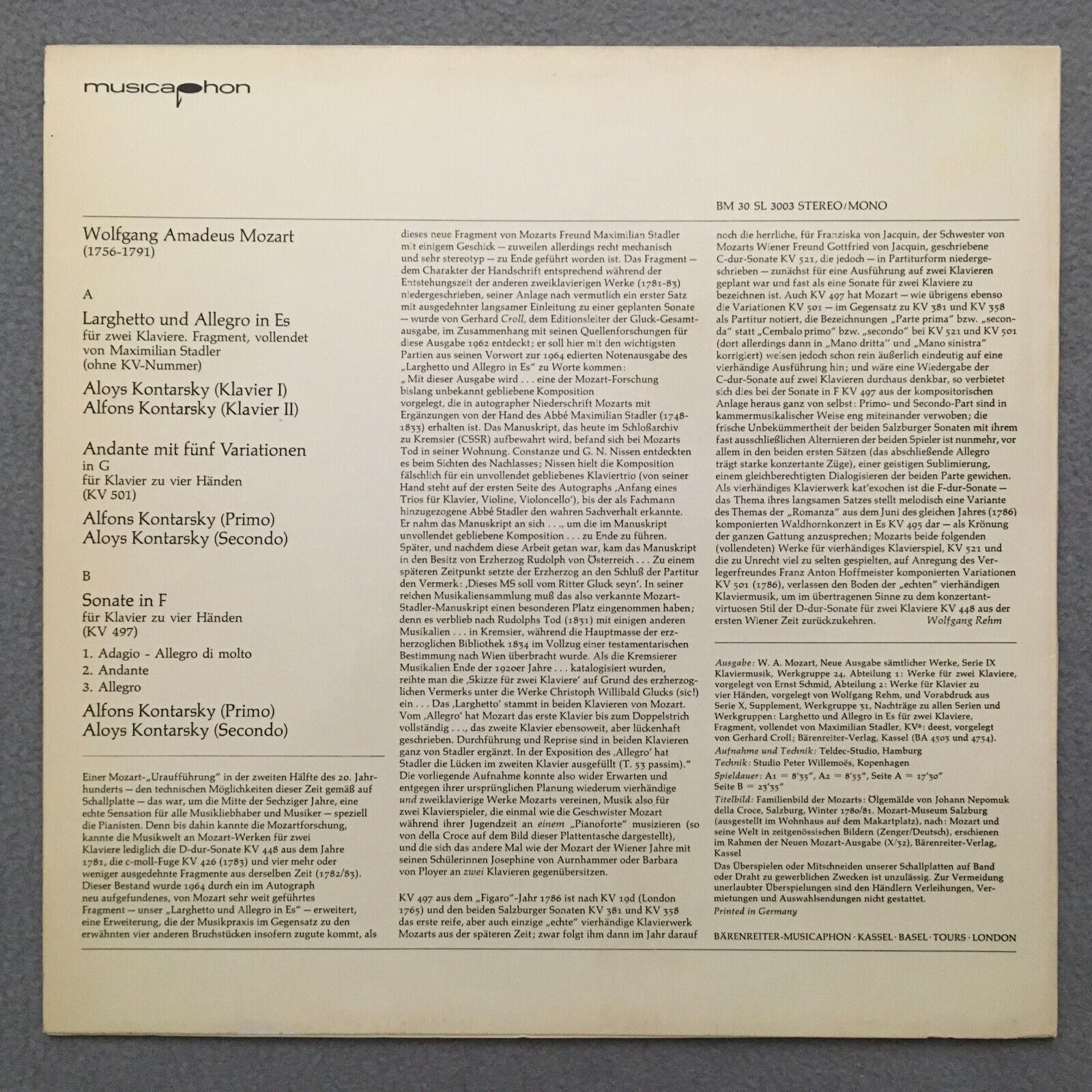 S261 Mozart Piano Works A. & A. Kontarsky Musicaphon BM 30 SL 3003 Stereo