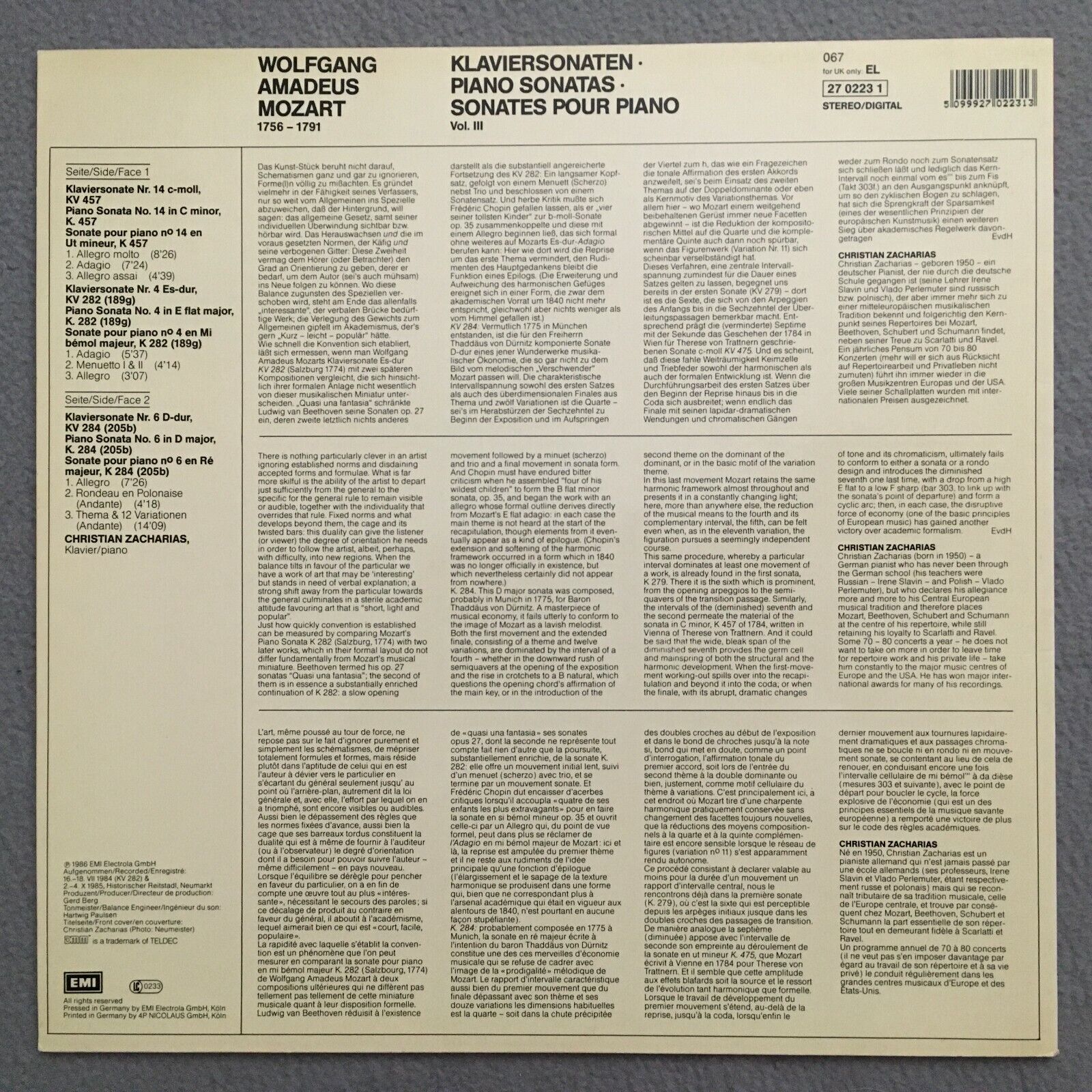 S264 Mozart Piano Sonatas Vol.3 Zacharias EMI 067 27 0223 1 Digital Stereo