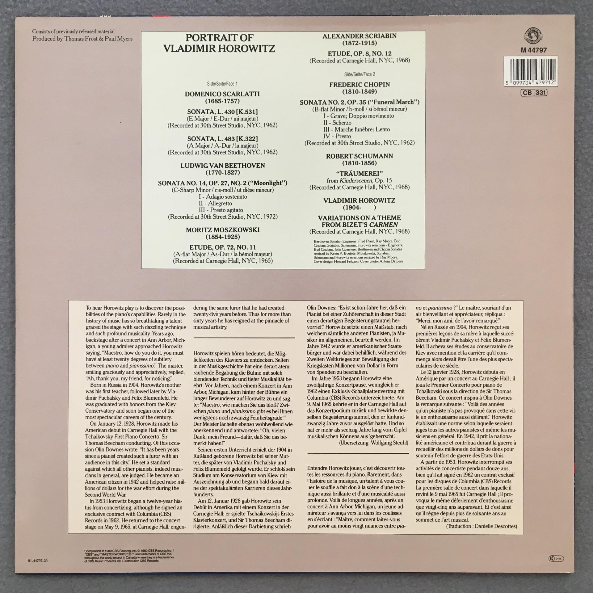 O503 Portrait of Horowitz Beethoven Chopin Scarlatti CBS M 44797 Stereo