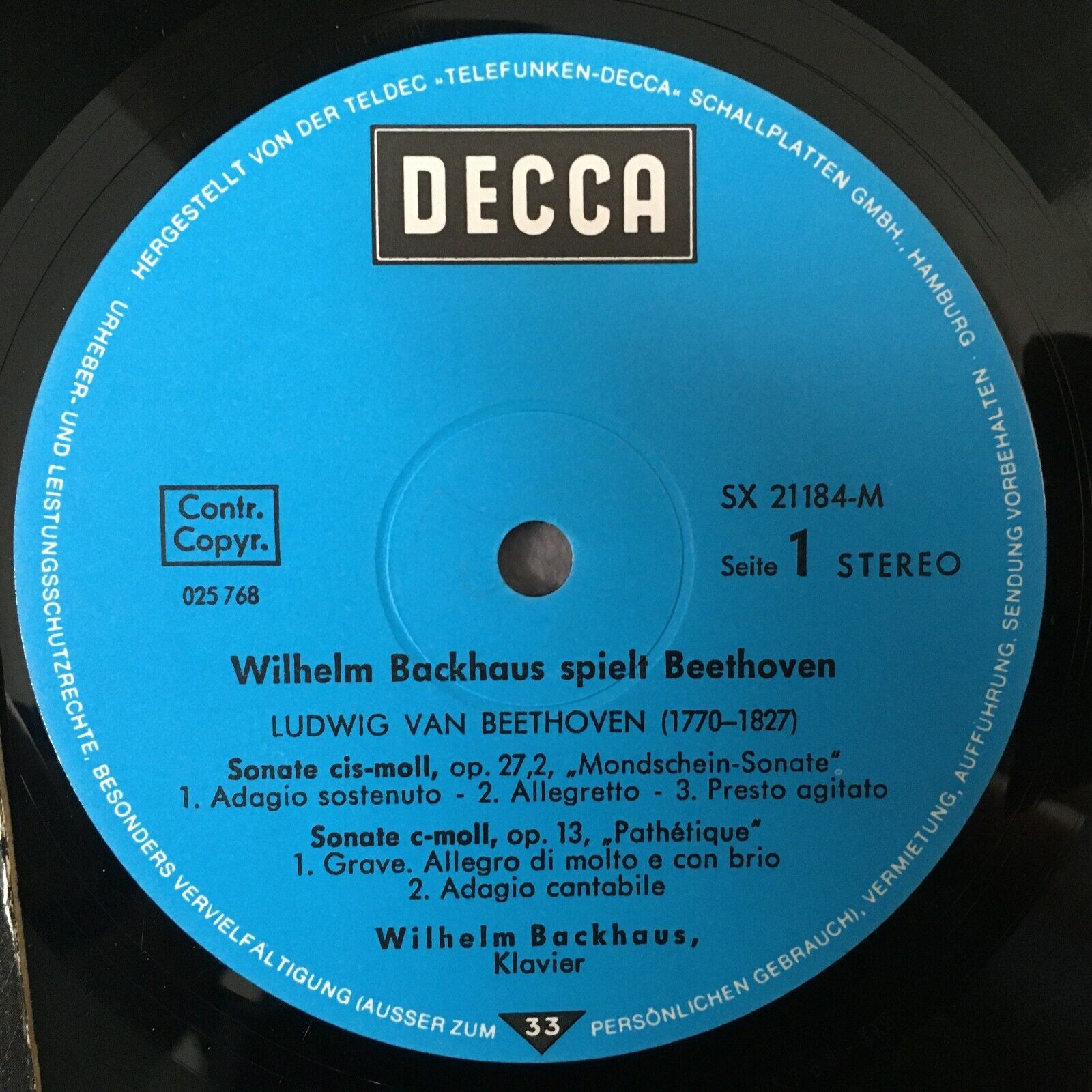 R976 Beethoven Sonatas Mondschein Appassionata Backhaus DECCA SX 21 184-M Stereo