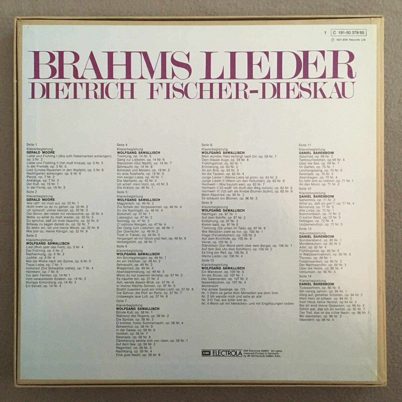 B907 Brahms Songs Fischer-Dieskau Moore Sawallisch 7LP E 1C 191-50 379/85 Stereo