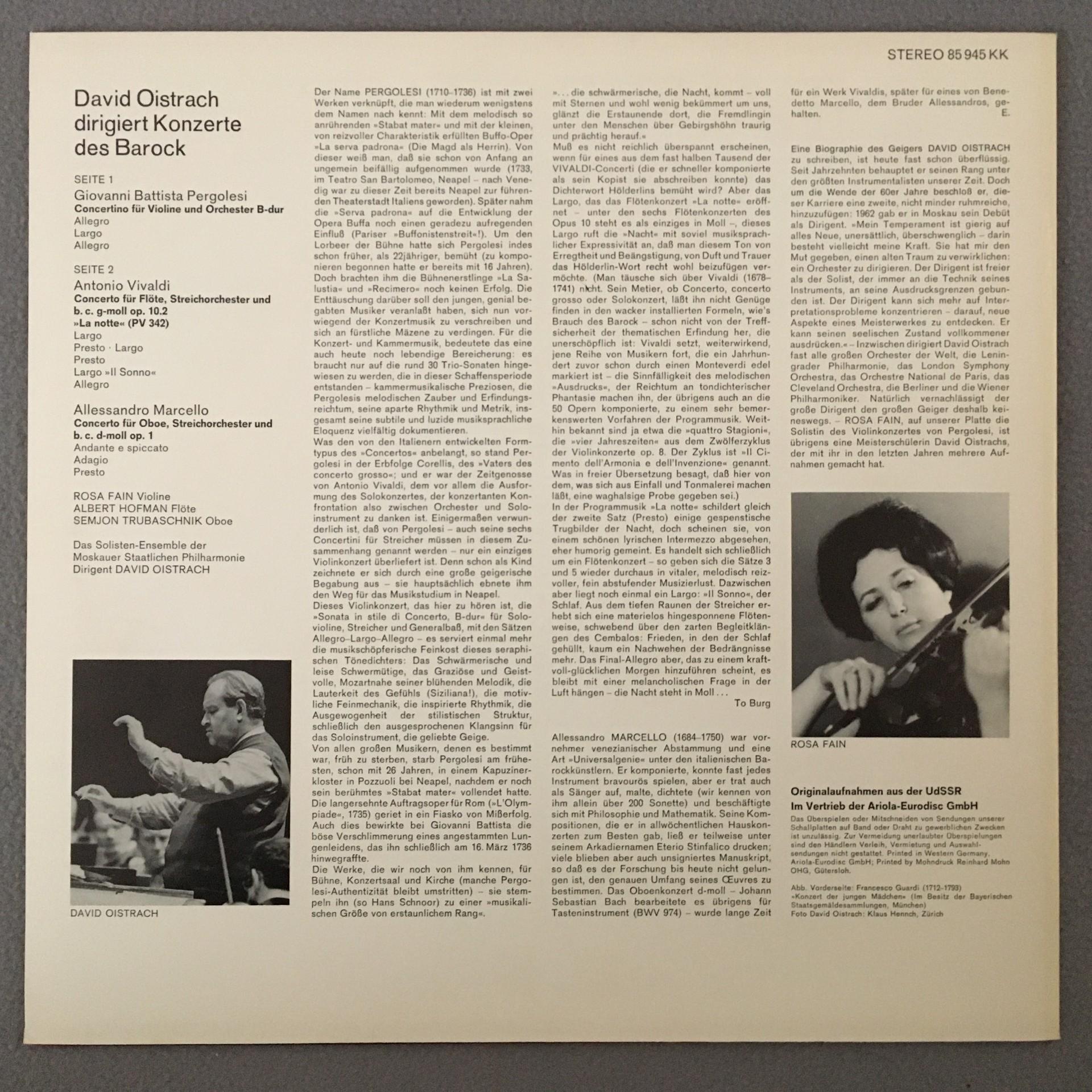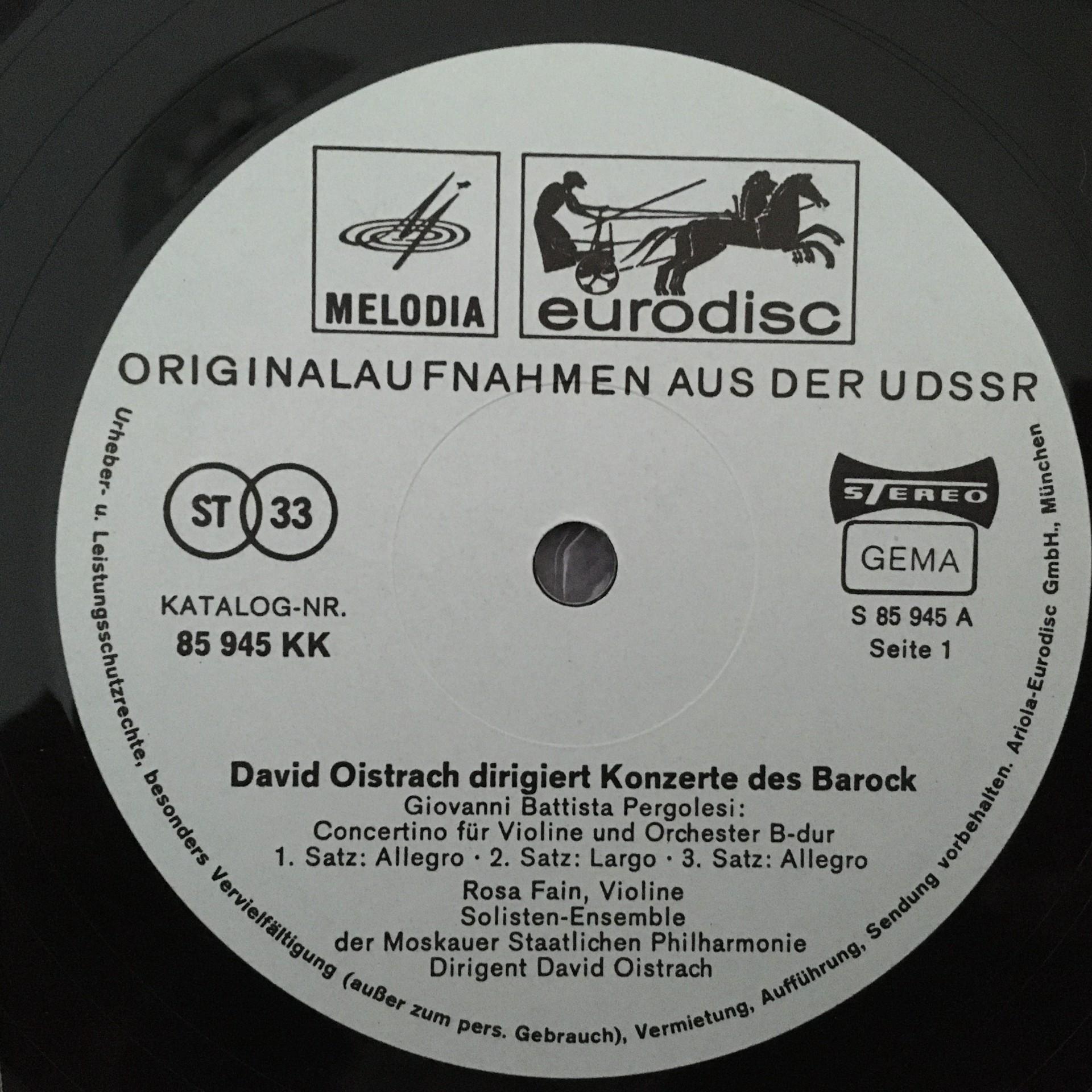 O676 Baroque Concertos Pergolesi Vivaldi Oistrakh Eurodisc 85 945 KK Stereo